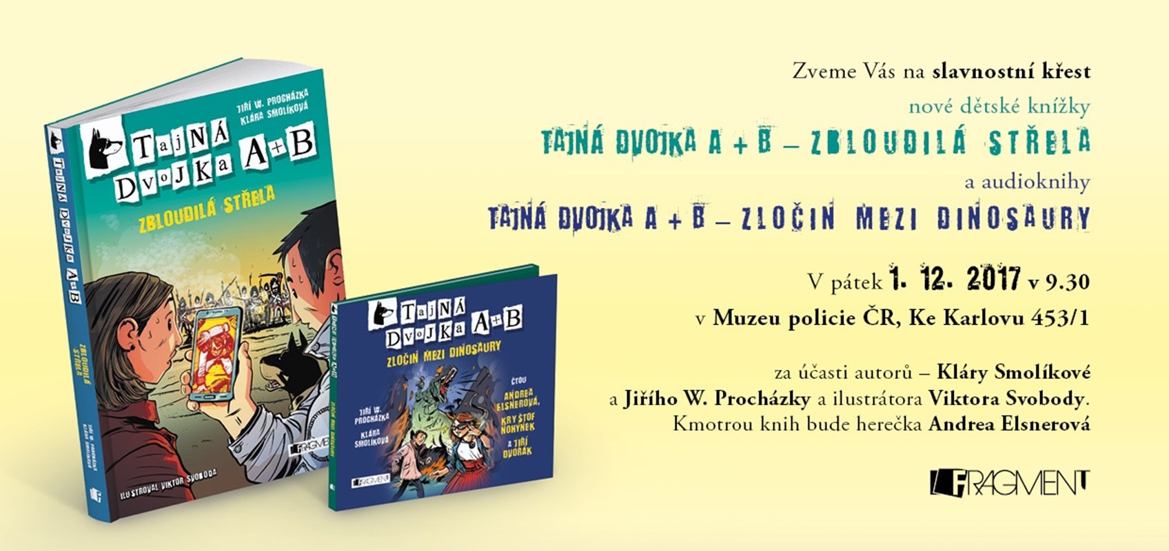 Na místě více než příhodném, v Muzeu policie ČR, pokřtíme v pátek 1. prosince nový díl oblíbené detektivní série pro děti Tajná dvojka A + B - Zbloudilá střela a také novou audioknihu Tajná dvojka A + B - Zločin mezi dinosaury.