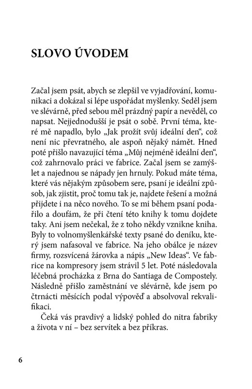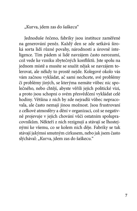 „Fabrika“ je nekompromisní, místy drsný a jindy groteskně vtipný pohled do života lidí ukrytých za zdmi výrobních hal. Seznamte se s postavami, které byste si sami nikdy nevybrali jako své kolegy – s Dědkem, jenž dokázal obelstít systém i šéfa a prozradí, jak na správnou masáž prostaty, s panem Romadurem, k němuž se nelze přiblížit na deset kroků, nebo s operátorem, který se dorozumívá výhradně mňoukáním. Každodenní dřina, pach potu, zvláštní rituály i nečekané jiskry lidskosti vytvářejí mozaiku, která čtenáře vtáhne a nepustí. „Fabrika“ vám ukáže, že i tam, kde vládne špína a olej, se odehrávají ty nejpodivnější i nejlidštější příběhy.