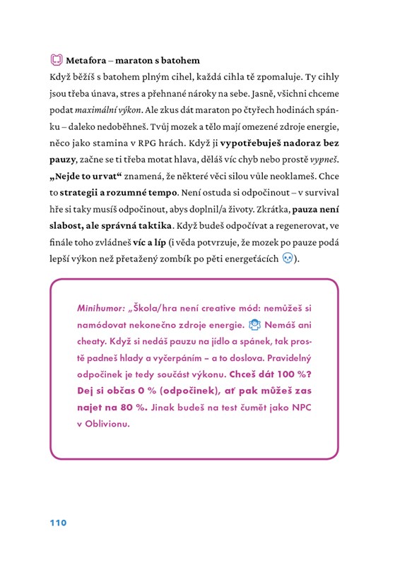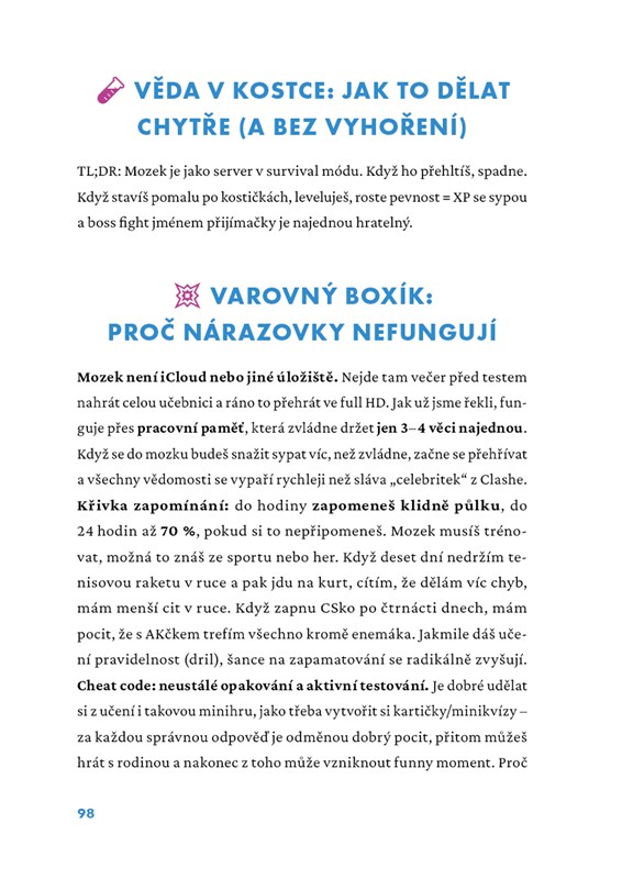 Dozvíš se, jak si rozvrhnout učení, zvládat nervy, vybrat školu, zůstat motivovaný a nezbláznit se z toho všeho. K tomu tipy na zdravý návyky, práci s vyhořením nebo na to, co dělat, když se ti fakt nechce. A nebojí se ani věcí, který se běžně neřeší – třeba jak si nastavit reálný cíle, kdy říct „stačí“ a proč není všechno jen o známkách.