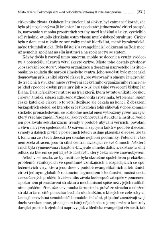 Kniha nastiňuje několik klíčových témat pro porozumění současné pozici, postojům a konfliktům katolické církve v globálním a českém kontextu. Církev si v druhé polovině 19. století konstruovala novou institucionální podobu a identitu a tento proces ji vrhá do stále nových konfliktů se společností a kulturou moderní éry. Těžištěm knihy je otázka hodnot, na kterou se církev v (post)moderní době velmi upnula. Podrobněji analyzuje tři zásadní výzvy: otázku těla a tělesnosti, kněžství a synodalitu, které souvisejí s otázkou moci. Detailní vhled nabízí i do vývoje papežství v 21. století a do proměn české církve po roce 1989. Nakonec jsou pojednány hlavní výzvy pro budoucí vývoj církve a její působení v kontextu rozdělené společnosti, včetně varianty postinstitucionálního křesťanství.