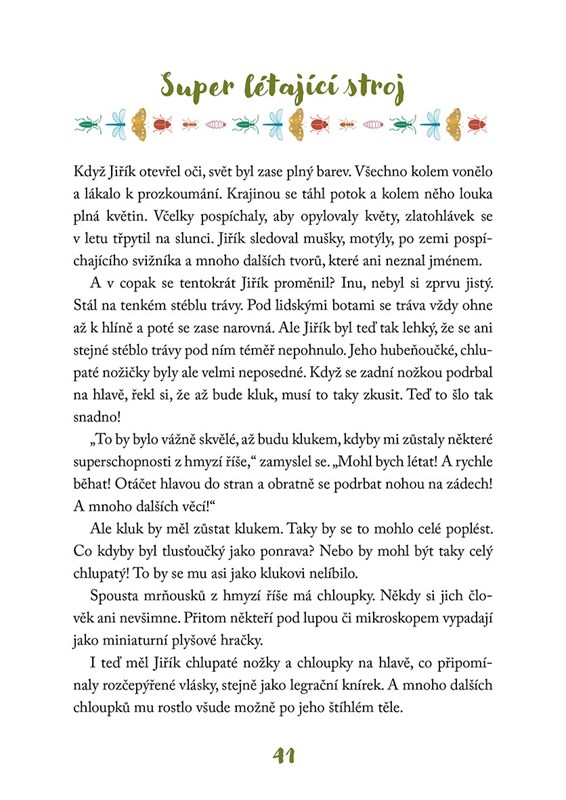 Aby se mohl vrátit zpátky jako kluk, musí si na vlastní kůži vyzkoušet, jaké to je být maličký. Postupně obléká jeden „hmyzí kabátek“ za druhým a stává se včelou, kobylkou, ponravou, zlatohlávkem, svižníkem, motýlicí, mravencem i dalšími tvory z fascinujícího světa pod našima nohama. Čekají ho dobrodružství, nečekaná setkání, nebezpečí i zázraky, které lidé často přehlížejí. Jiřík brzy zjistí, že i ten nejmenší brouček má v přírodě své důležité místo. Dokáže se ale i on sám opravdu změnit a pochopit, na čem skutečně záleží?