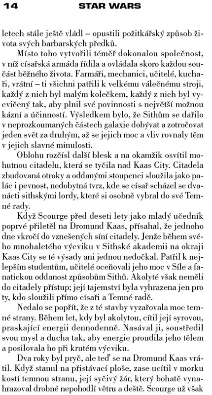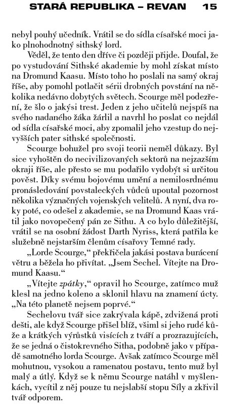 Co se stalo za Vnějším okrajem? Co mu brání vzpomenout si a zároveň zapomenout? Jistý si může být jen jednou věcí: samotné základy Republiky ohrožuje cosi temného. Revan netuší, jak hrozbu odhalit, natož zneškodnit. Nikdy nečelil mocnějšímu a ďábelštějšímu protivníkovi. Jeho úsilí je dost možná odsouzeno k nezdaru, ale zastavit ho může jen smrt.