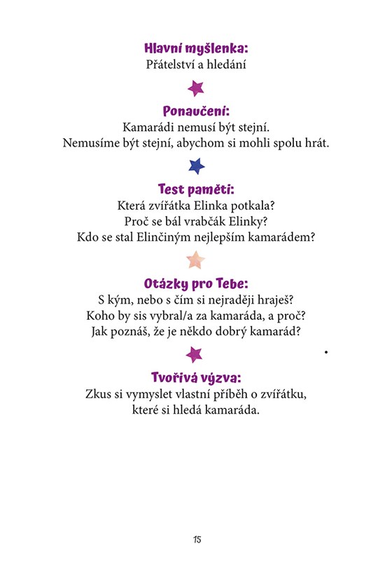 Každá pohádka končí otázkami k zamyšlení a nechybí ani básničky a prostor pro dětské kreslení. Krásné ilustrace, poutavé příběhy a prostor pro tvořivost dělají z knihy zážitek pro celou rodinu.