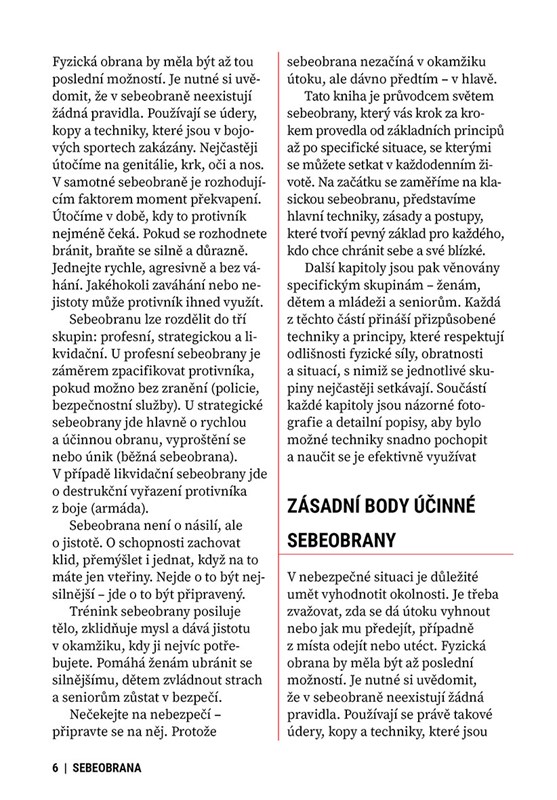Publikace, napsaná zkušeným instruktorem sebeobrany s desítkami let praxe, vám ukáže, že nejúčinnější zbraní není hrubá síla, ale připravená mysl a rychlá akce. Autorovy bohaté zkušenosti se promítají do každé kapitoly – od psychologické prevence až po postupy šité na míru ženám, dětem i seniorům. Všechny techniky sebeobrany jsou detailně rozfázované na stovkách názorných fotografií, které vám umožní popsané pohyby snadno pochopit a správně si je osvojit.