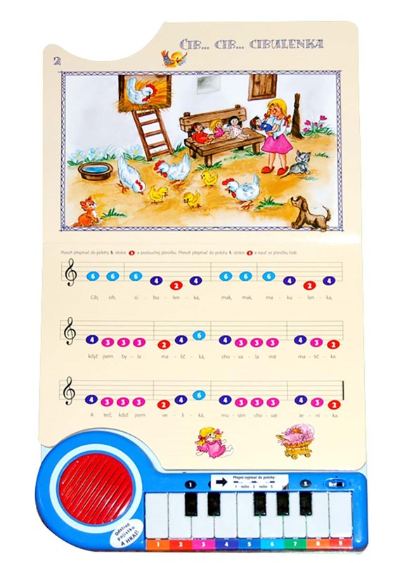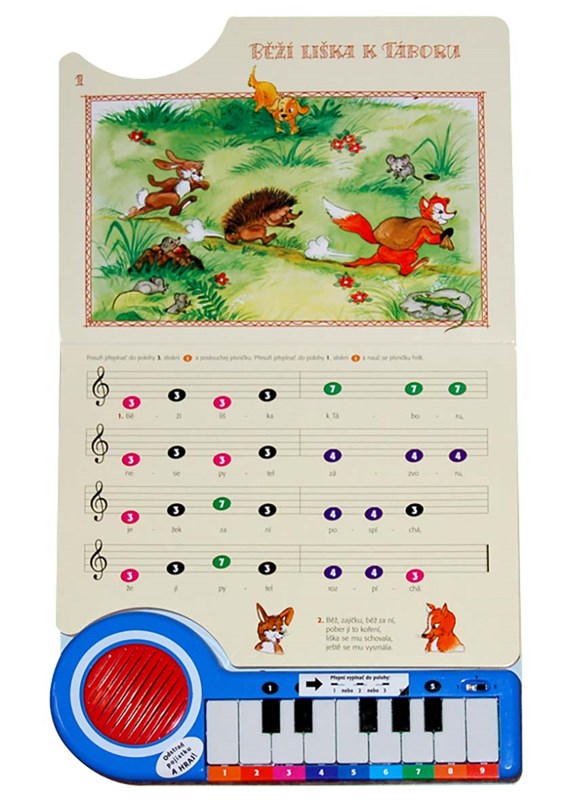 Skákal pes přes oves, Ovčáci, čtveráci, Spi, děťátko, spi, Běží liška k Táboru - zahrajte a zazpívejte si nejoblíbenější lidové písničky. Ve zpěvníku s elektrickým pianem najdete dvanáct písniček, které se snadno naučíte hrát a zpívat podle světýlka: stačí, když budete tisknout klávesy, které označí světýlko. Písničky můžete také jenom poslouchat nebo hrát podle barevných not. Tato knížka se jistě brzy stane pro vašeho malého muzikanta skvělým společníkem.