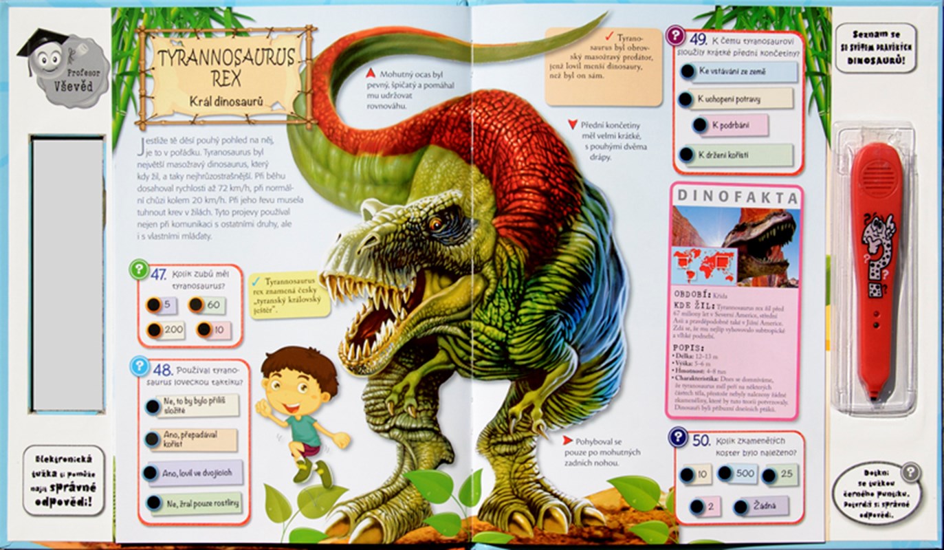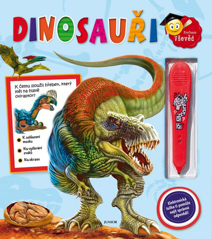 Chceš vědět, jací živočichové žili na naší planetě před stovkami milionů let? Jak rychle se pohybovali? Čím se živili? Jak byli velcí? Kterým dnešním zvířatům se podobali? V této knize se můžeš seznámit se světem pravěkých dinosaurů a dovědět se to nejzajímavější o jejich životě. Na mnoho zajímavých otázek ti pomůže najít správnou odpověď elektronická tužka. Stačí se tužkou dotknout černého puntíku. Pokud se rozsvítí zelené světélko, tvoje odpověď je správná. Červené světélko říká, že to není správně, musíš to zkusit znovu.