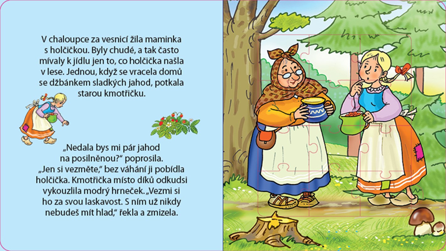 5 skládaček puzzle - Pohádka a puzzle v jednom! Není leporelo jako leporelo, jak dokládá tato unikátní dětská knížečka. Kouzelné ilustrace k jedné z nejoblíbenějších pohádek tu mají podobu puzzle, které si mohou děti samy opakovaně skládat. Díky tomu se nejen důvěrněji seznamují s hrdiny a prostředím pohádky, ale současně tím rozvíjejí i své poznávací a motorické schopnosti.