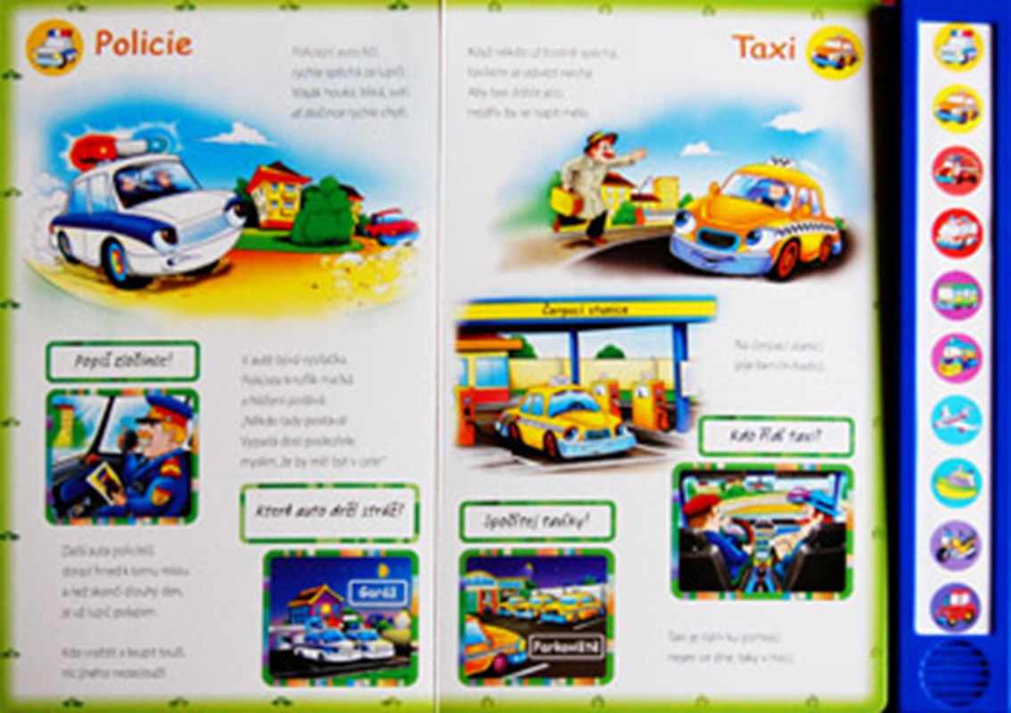 Tato knížka pomůže dětem seznámit se se zvuky dopravních prostředků. Stačí lehce stisknout obrázek na zvukové hračce, zaposlouchat se a zvuky napodobit. Kniha obsahuje hezké obrázky a také verše se stručným popisem dopravního prostředku a toho, co dělá.