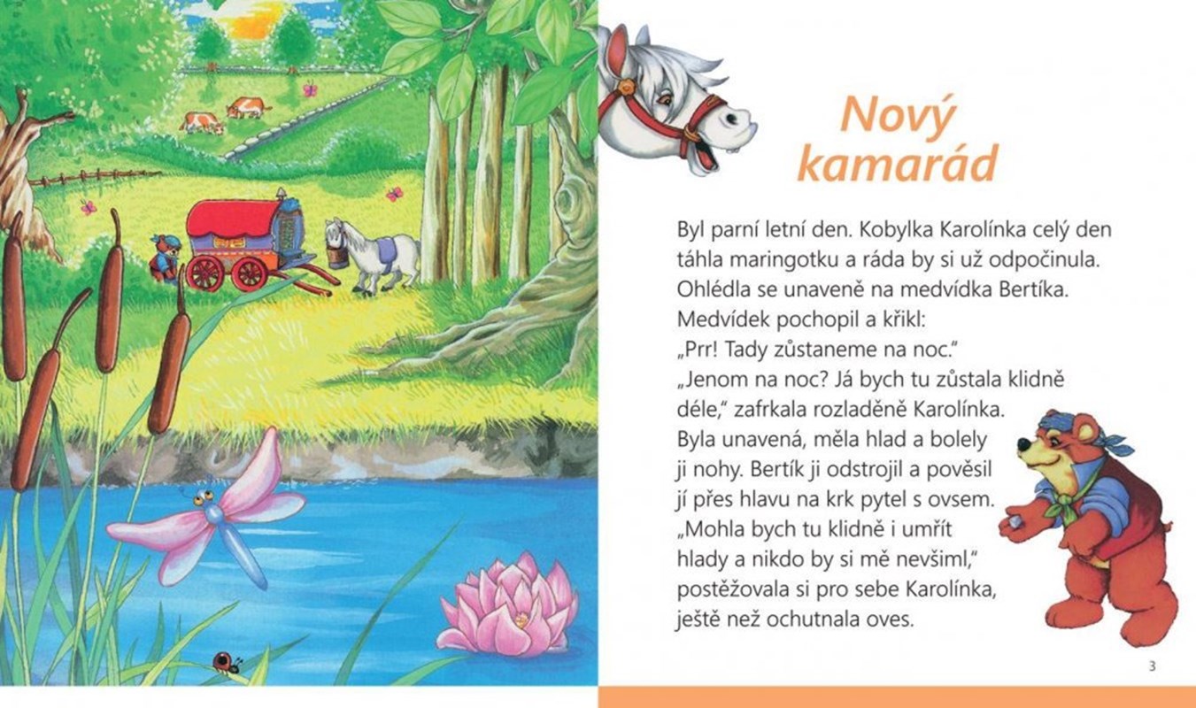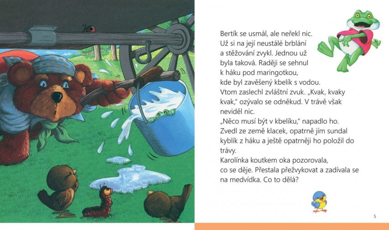 Víš, kdo je Bertík? A kdo Karolínka a Kvákalka? Ne? Tak to honem naprav! Když se začteš do téhle knížky, dovíš se to. Poznáš nabručenou kobylku, které spraví náladu nové boty, žabičku, která bydlí v otlučeném kbelíku, a méďu, který se o ně stará. A navíc můžeš vyřešit několik úkolů a pocvičit se ve čtení.