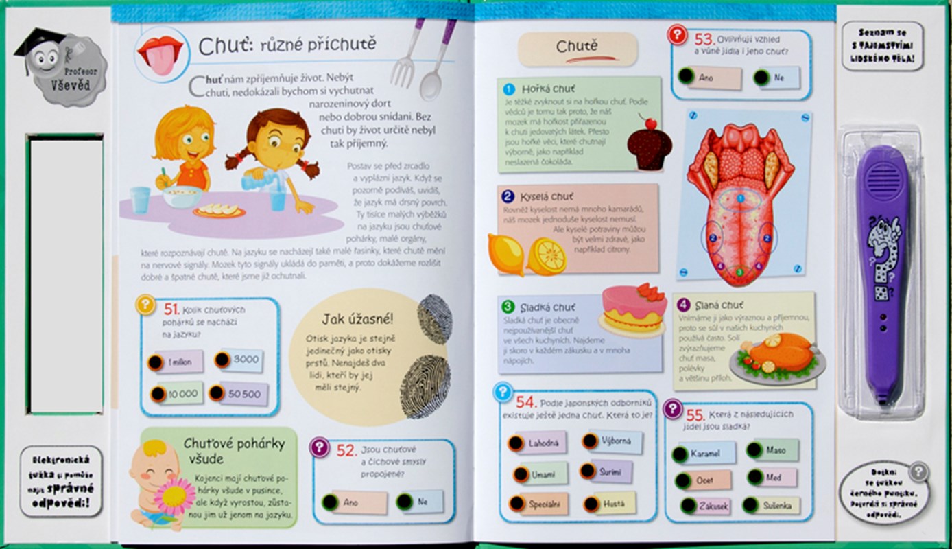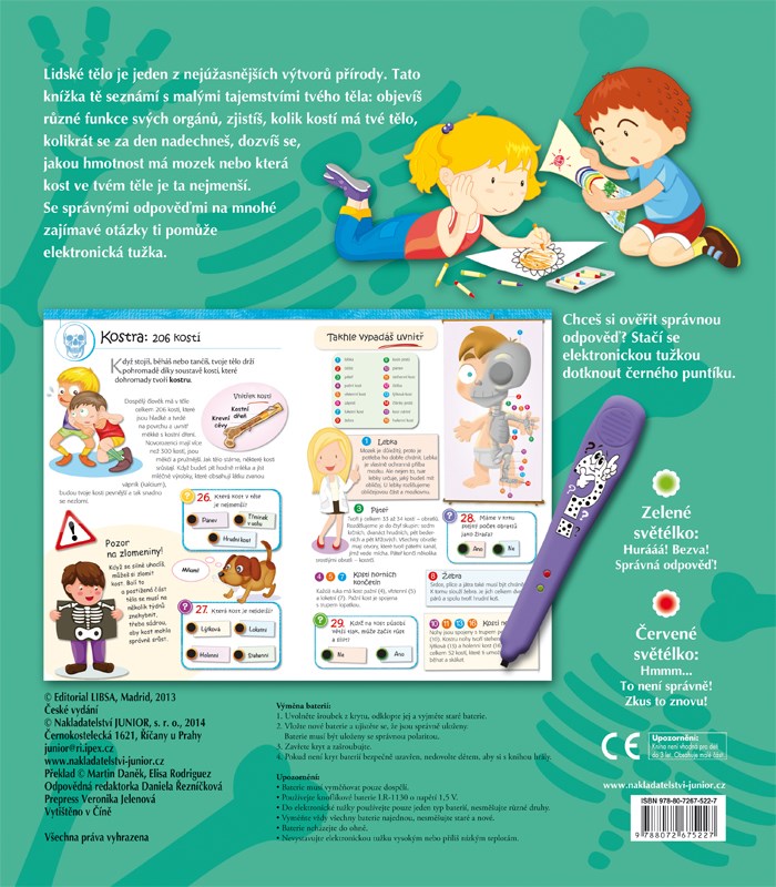 Lidské tělo je jeden z nejúžasnějších výtvorů přírody. Tato knížka tě seznámí s malými tajemstvími svého těla: objevíš různé funkce svých orgánů, zjistíš, kolik kostí má tvé tělo, kolikrát se za den nadechneš, dozvíš se, jakou hmotnost má mozek nebo která kost ve tvém těle je ta nejmenší. Se správnými odpověďmi na mnohé zajímavé otázky ti pomůže elektronická tužka. Stačí se tužkou dotknout černého puntíku. Pokud se rozsvítí zelené světélko, tvoje odpověď je správná. Červené světélko říká, že to není správně, musíš to zkusit znovu.