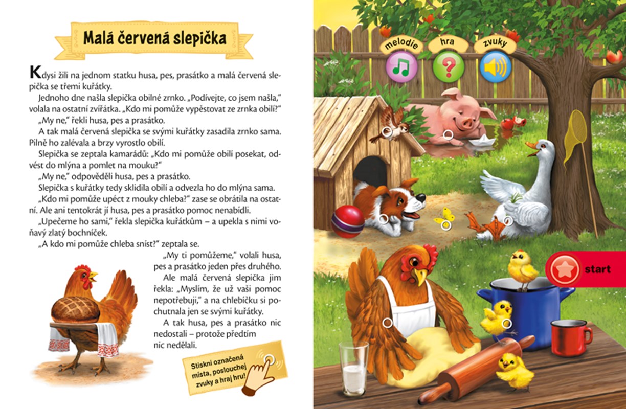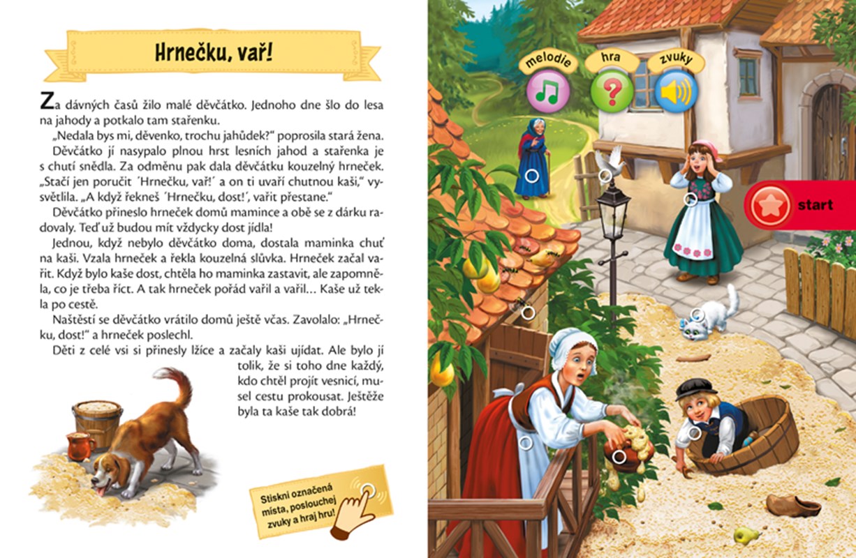 50 ZVUKOVÝCH OBRÁZKŮ - Perníková chaloupka, O Červené karkulce, Hrnečku vař! O panáčkovi z perníku... to jsou některé z oblíbených pohádek, které najdeš v knížce Mluvící pohádky. Tato kniha je navíc kouzelná – obrázky v ní umí mluvit! Při čtení pohádky stačí stisknout obrázek a uslyšíš hlasy a zvuky. Zábavná hra Uhodni zvuk a veselé tóny už na tebe čekají!