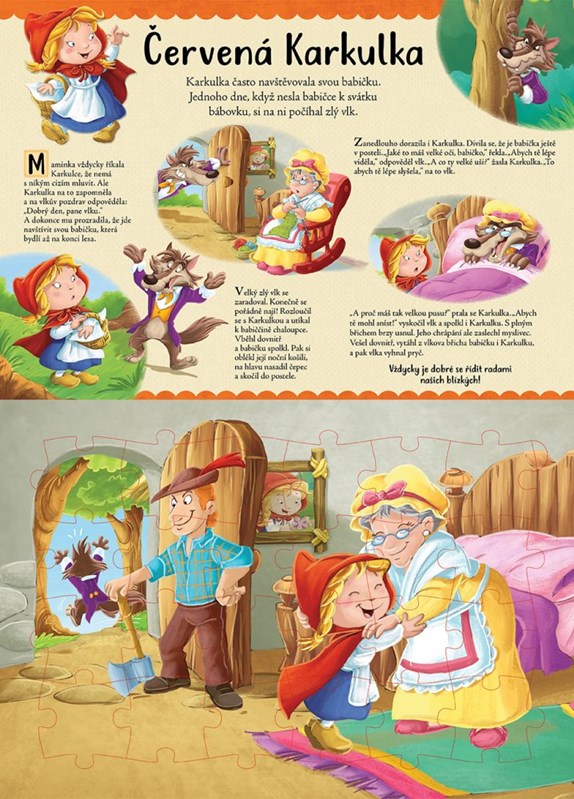 Některé půvabné příběhy nás nikdy neomrzí. A také se z nich můžeme o lecčem poučit. Není nad to, si je občas připomenout a znovu se pobavit s Pinocchiem, Karkulkou, třemi prasátky, ošklivým káčátkem i se Zlatovláskou a třemi medvědy. Ale nejen to! V knize najdeme také puzzle, z kterých si děti k příběhům můžou složit obrázek. A navíc i šablonu, s kterou bude hračka si oblíbené hrdiny nakreslit. Uvnitř 4 puzzle a šablony ke kreslení