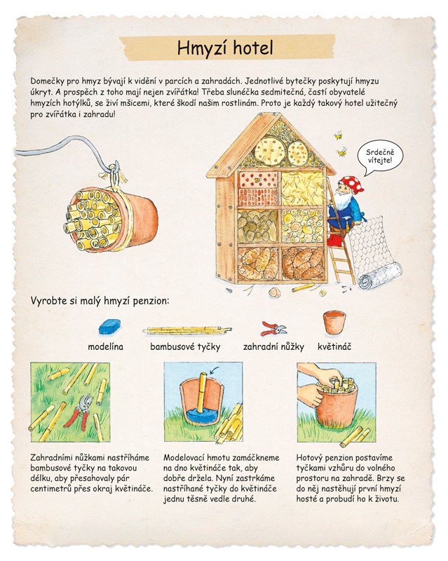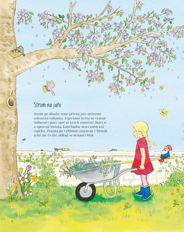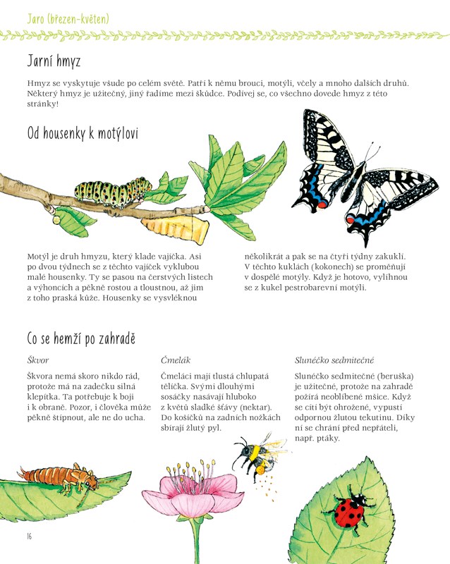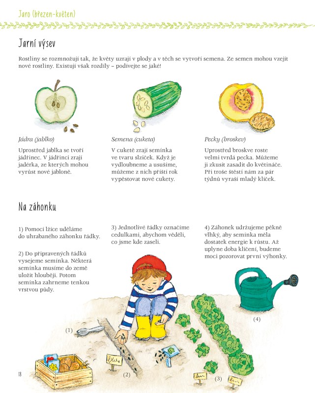 Kniha rozdělená na 4 části – jar, léto, podzim, zima – učí děti, jak vypěstovat a sklidit svou první úrodu a mít z ní radost. Nabádá je k tomu, aby si všímaly rostliny, zvířata a hmyz v zahradách nebo ve volné přírodě. Najdou v ní také zajímavé tipy a rady pro každé roční období. Třeba si můžou vyrobit malý hmyzí hotel, dobroty pro ptáčky na zimu nebo se dozví, proč mění listy na podzim barvu. Kniha je určená dětem od 3 let.