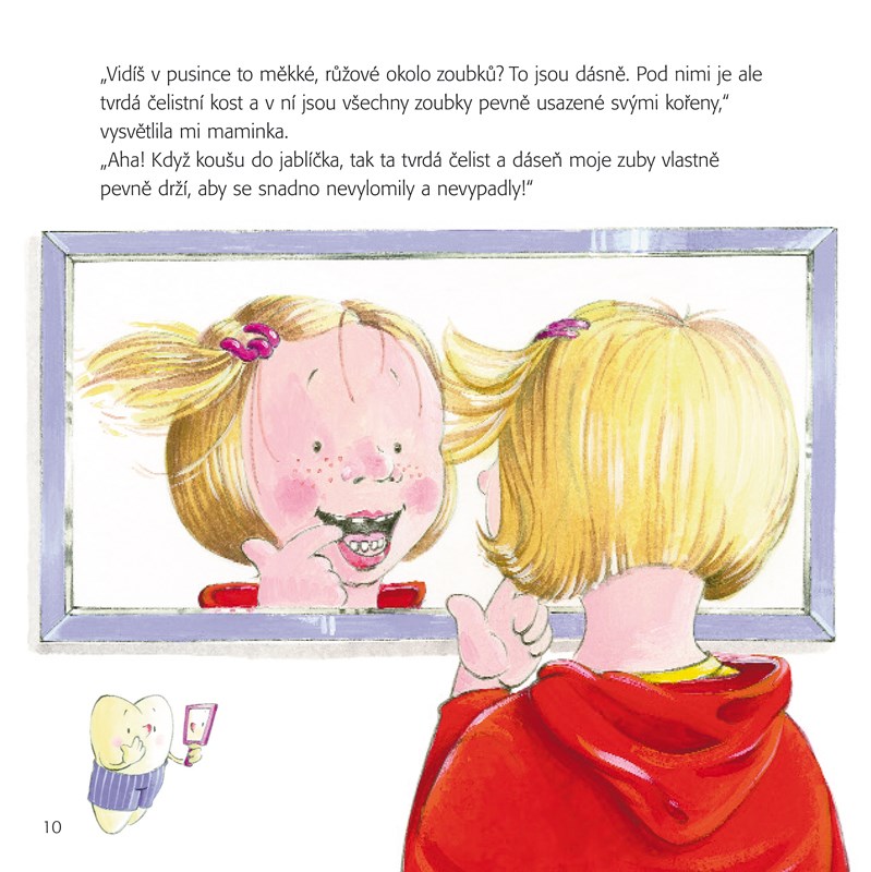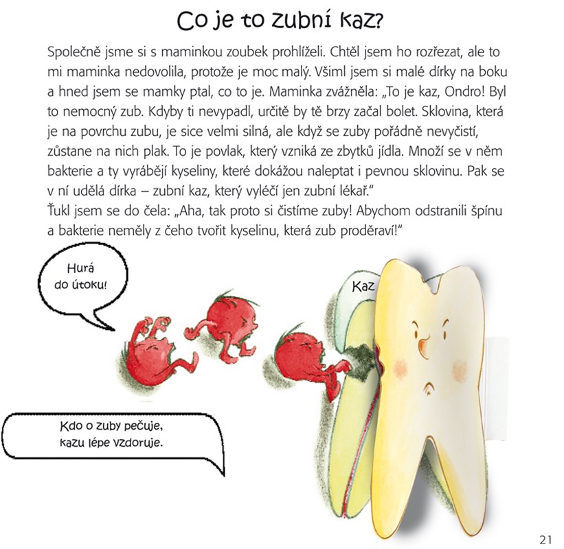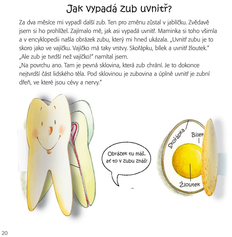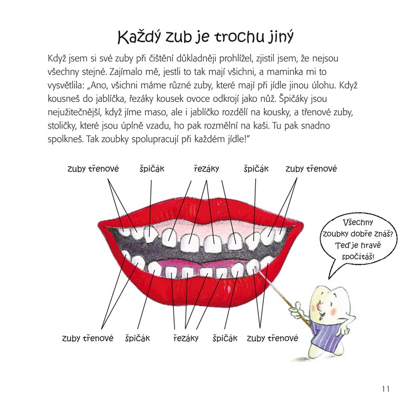 S krabičkou na první zoubky Tato milá interaktivní knížka pomůže dětem pochopit, jak probíhá výměna zubů, jak zoubky vypadají, ale hlavně, jak o ně správně pečovat, aby byly zdravé. V přední obálce je uložena malá plechová krabička, která dětem poslouží k uschování mléčných zoubků. Mohou si je schovat na památku, stejně jako tuto knížku!