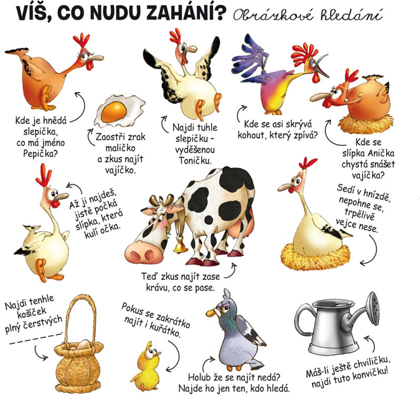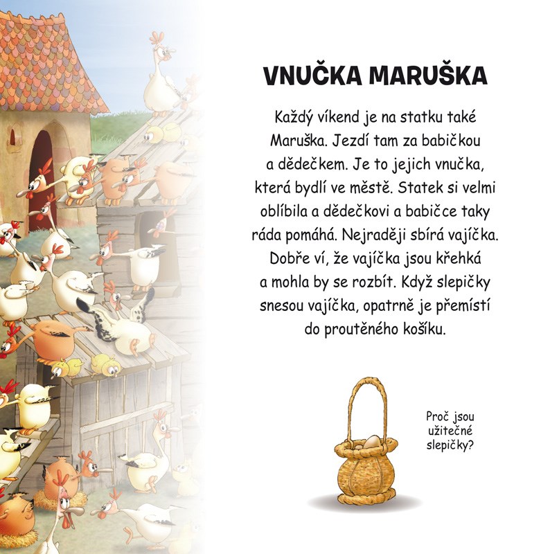 S touto knížkou zažijete spoustu zábavy. Společně s babičkou Evičkou a dědečkem Toníkem se můžete seznámit s prací na statku. Poznáte mnoho domácích zvířat, zjistíte, čím jsou pro nás užitečná, a dozvíte se spoustu dalších zajímavostí. Na celostránkovém obrázku můžete navíc vyhledávat jednotlivé detaily podle veršovaných instrukcí. Nudit se rozhodně nebudete, protože obrázkové hledání nudu skvěle zahání.