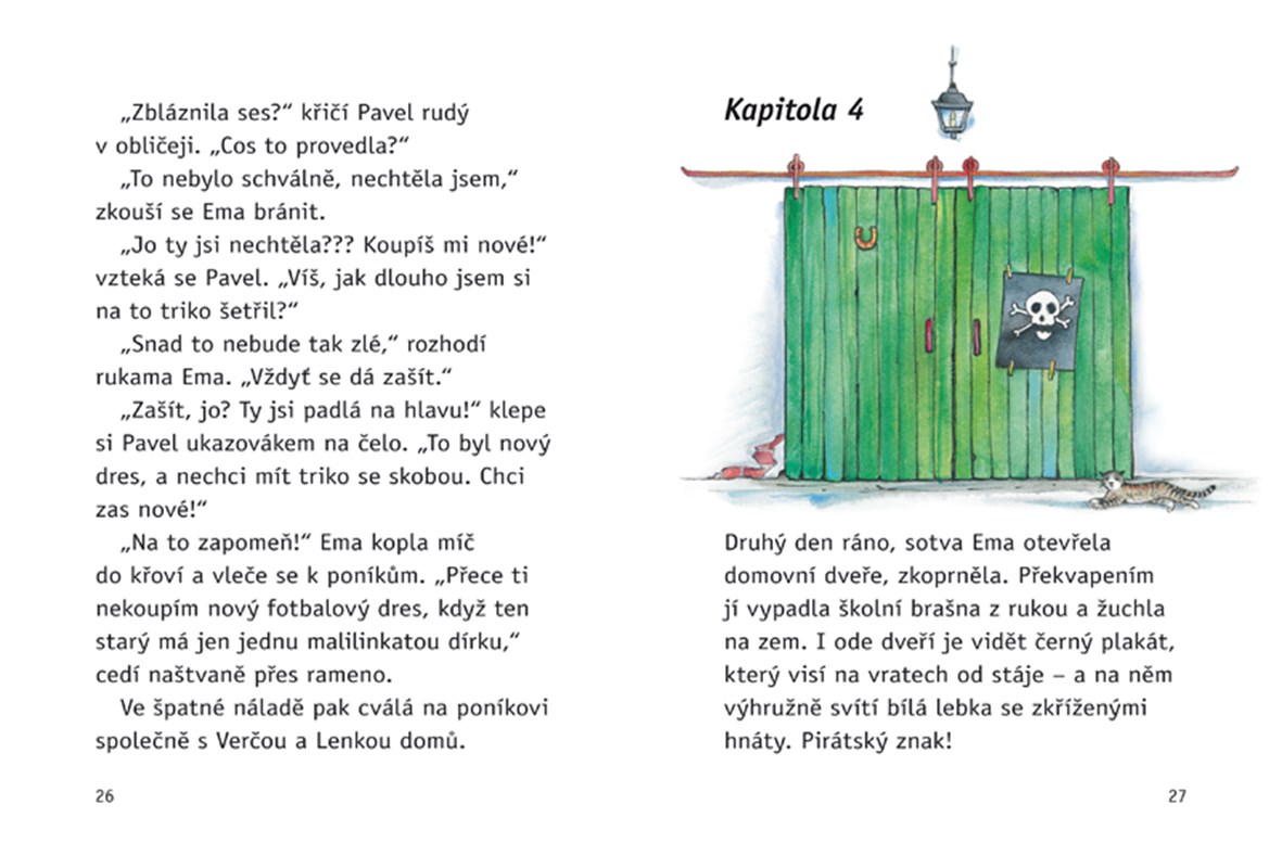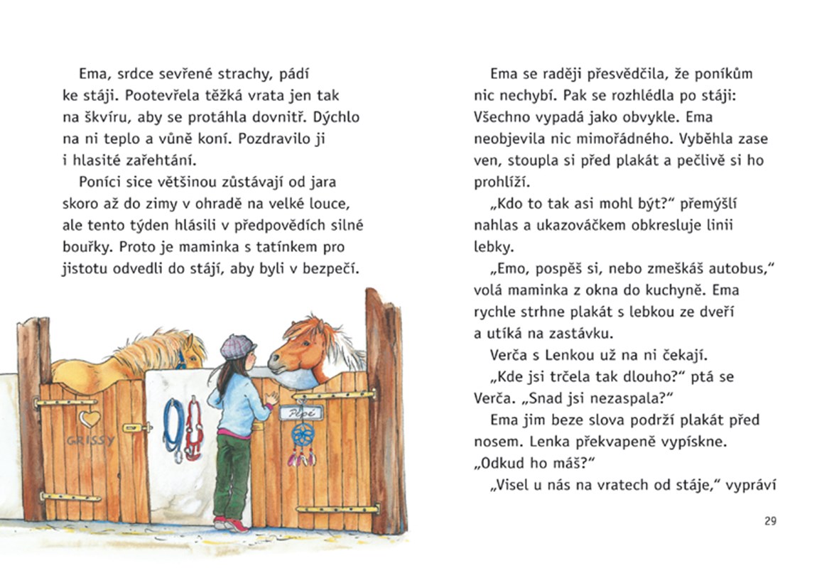 Příběhy o třech kamarádkách a jejich ponících. Pirátský znak - bílá lebka se zkříženými hnáty. Objevuje se na vratech stáje, pod držáky na uzdy, ale i na buclatém břiše poníka Sindy. Kdo to udělal? A kdo ukradl fotoaparát? Verča, Lenka a Ema to vypátrají. Najdou ve stáji stříbrný náramek se jménem spolužačky Sáry a ještě navíc vymyslí projekt, který má ve škole obrovský úspěch. Fotí poníky. Sindy má bílé a černé pruhy jako zebra, Pepé a Ferda září lví barvou a hřívy jim zhoustly stuhami z krepového papíru. Jsou to skvělé fotky ze safari.