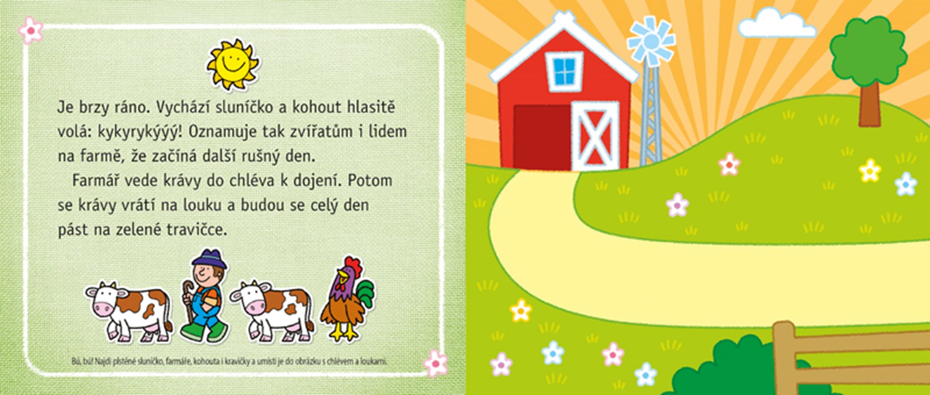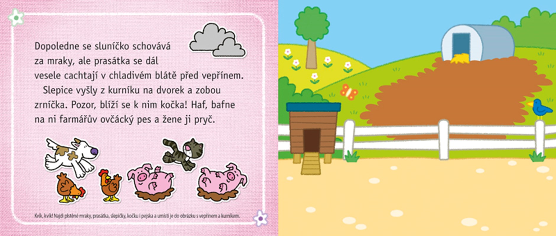 28 plstěných samolepek a 5 scén ke hraní. V téhle knížce si nejen můžeš číst, ale můžeš si s ní také hrát! Kromě povídání totiž obsahuje barevné scénky ze života na farmě, do kterých můžeš umisťovat různé hrací dílky a příběh si tak ilustrovat pěkně po svém. Měkké plstěné dílky, mezi nimiž jsou nejen zvířátka, ale také třeba farmář, sluníčko nebo mrak, na stránkách dobře drží a použít se dají opakovaně, takže své obrázky můžeš různě obměňovat. Kniha je určená dětem od dvou let.
