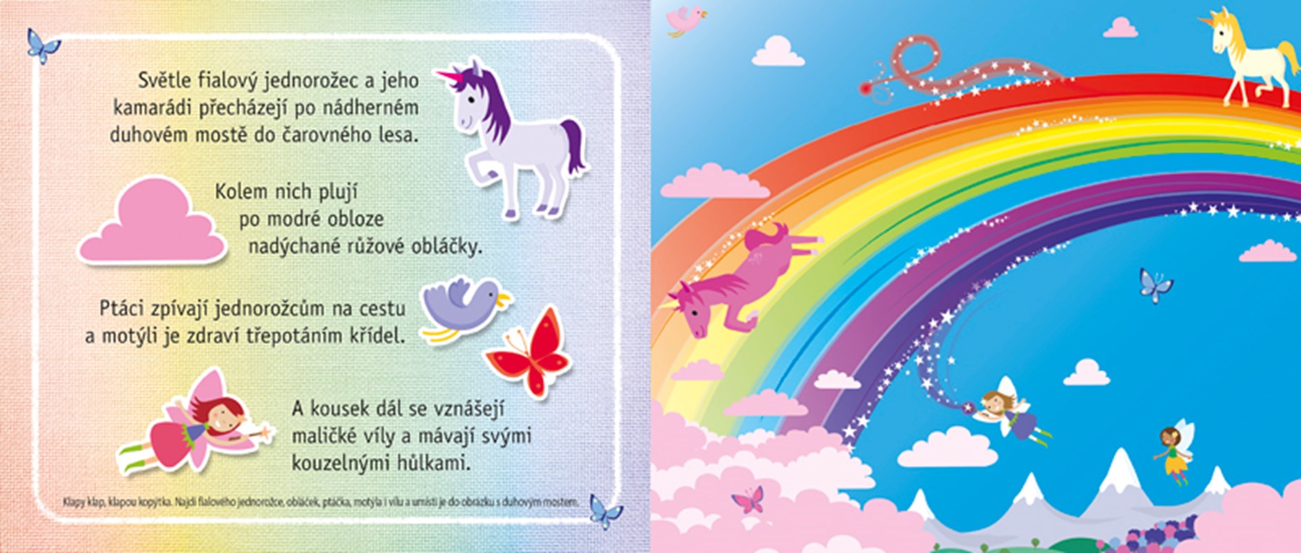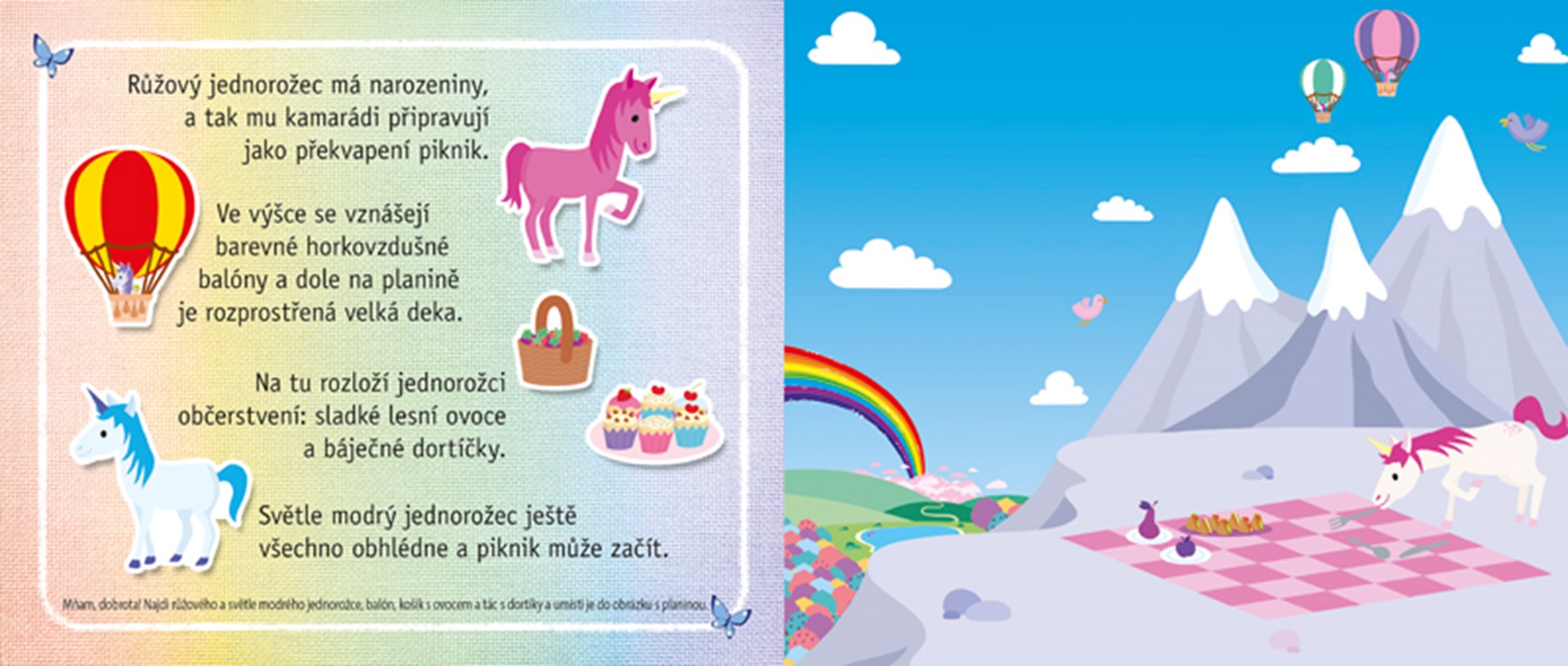 23 plstěných samolepek a 5 scén ke hraní. V téhle knížce si nejen můžeš číst, ale můžeš si s ní také hrát! Kromě povídání totiž obsahuje barevné scénky ze života jednorožců, do kterých můžeš umisťovat různé hrací dílky a příběh si tak ilustrovat pěkně po svém. Měkké plstěné dílky, mezi nimiž jsou nejen jednorožci a víly, ale také třeba ohňostroj nebo dobroty na piknik, na stránkách dobře drží a použít se dají opakovaně, takže své obrázky můžeš různě obměňovat. Kniha je určená dětem od dvou let.