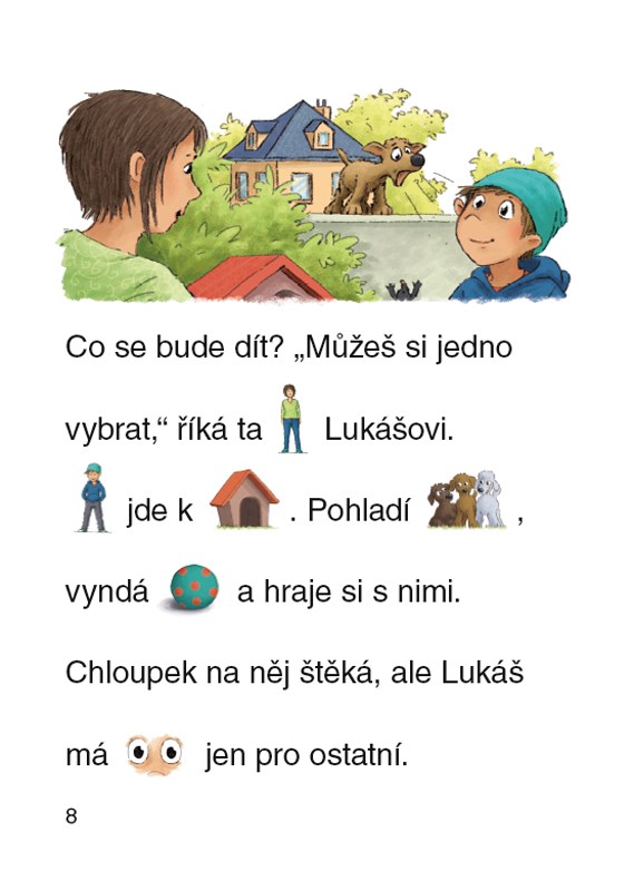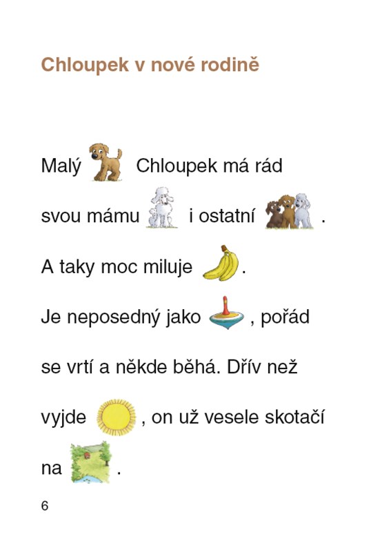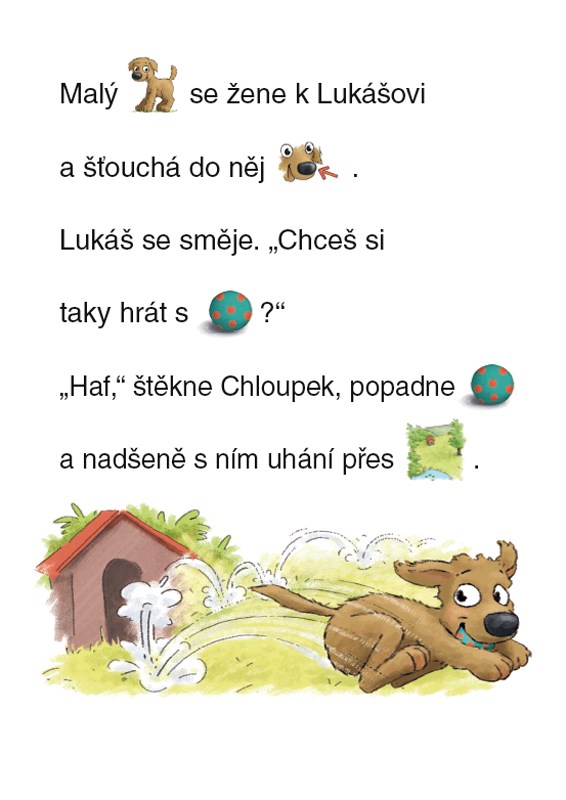 Obrázkové čtení. Samostatně i s pomocí rodičů mohou mladší děti vstoupit do světa obrázkového čtení s úsměvným příběhem malého pejska Chloupka. Ze svého původního domova se odstěhoval ke svému novému páníčkovi, klukovi Lukášovi, a teď se seznamuje s domem, ve kterém Lukáš s rodiči bydlí, i s jeho okolím. Díky tomu, že jsou mnohá slova v textu nahrazena obrázky, je čtení o Chloupkových dobrodružstvích snazší i zábavnější.
