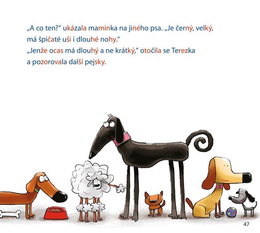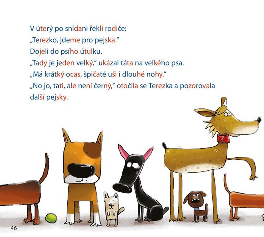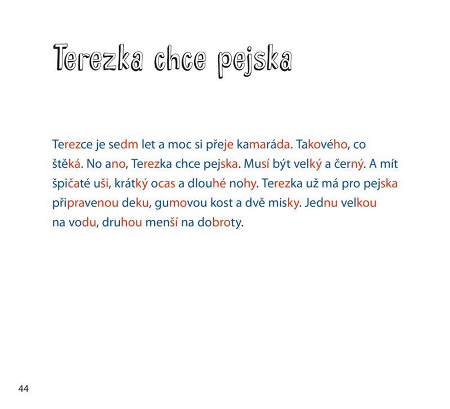 Barevné slabiky usnadňující čtení. Typ písma vhodný pro začínající čtenáře a dyslektiky. V této jedinečné knize najdou děti zábavné příběhy holčičky Terezky, chameleona Leona a mnoha dalších hrdinů. Slova každého příběhu jsou rozdělená do slabik v červené a modré barvě a jsou použita snadno čitelná písmena. Kniha využívá ověřenou výuku čtení po slabikách, přičemž barevné slabiky čtení ještě usnadňují. Pomáhají dětem nejen spojovat slabiky do slov, ale i poznávat shodné slabiky v různých slovech. Vznikla tak perfektní knížka pro výuku čtení, vhodná jak pro děti, které se čtením začínají, tak pro ty, které mají se čtením problémy.