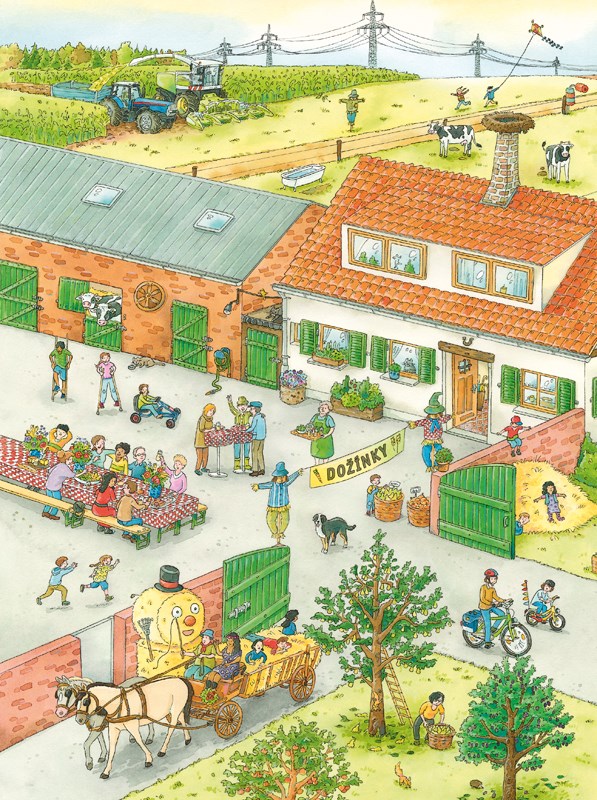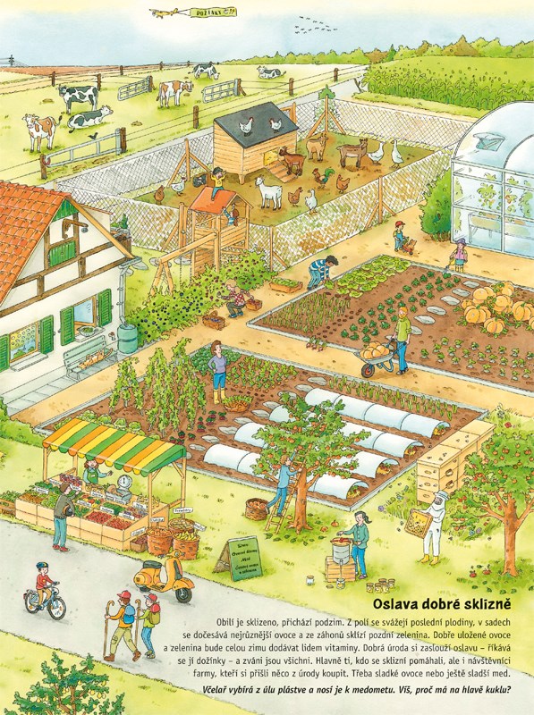 Zažij rok na farmě! Od jarního setí do prvního sněhu. Na takové velké farmě se celý rok něco děje. Pracuje tu mnoho lidí a strojů, a také tu žije hodně zvířat. S tím vším se můžeš seznámit – stačí otevřít tuto knihu. Prozkoumej báječné panoramatické obrázky, které ti do detailu představí život na farmě ve čtyřech ročních obdobích. Pokaždé na nich objevíš něco nového – třeba i to, co se ukrývá. Prohlédni si zvířata, pro které je farma domovem, a seznam se i s jejich mláďaty. Poznej také vozidla a stroje, které farmářům pomáhají s těžkou prací. A potěš se pohledem na bohatou sklizeň všemožných dobrých věcí, které se na farmě pěstují.