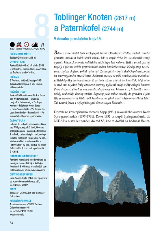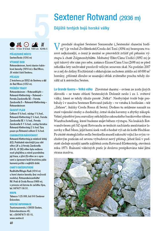 30 neobyčejných túr. Historická fakta a zajímavosti. GPS tracky ke stažení. Dolomity se v letech 1915-1917 staly dějištěm tragických válečných událostí. Touto jedinečnou přírodní kulisou probíhala jihotyrolská fronta 1. světové války, na níž padly statisíce vojáků rakouské a italské armády. Dodnes tu v terénu narážíme na četné stopy bojů, staré vojenské stezky a bývalé válečné pozice. Autor knihy představuje celkem 30 mimořádně atraktivních túr, které vedou těmi nejzajímavějšími frontovými lokalitami – od Sextenských Dolomit přes Marmoladu až po náhorní plošinu Lavarone a masiv Pasubio. Podrobné popisy tras doplněné mapkami a množstvím fotografií. Zasvěcený pohled na historické a geopolitické souvislosti. raktické rady a informace včetně tipů na vybavení a zajištění bezpečnosti. GPS data ke stažení.
