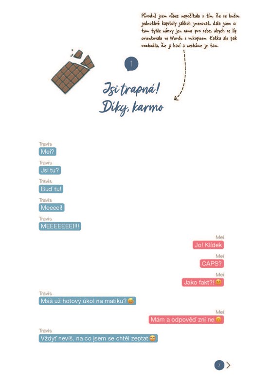 Když se o ni Travis konečně začne zajímat, je to v tu nejméně vhodnou chvíli. Mei je nemocná a polibek, o kterém sní od doby, co si přestala hrát s panenkami, musí ještě chvíli počkat. Zatím můžou randit tak maximálně přes messenger. Bude ale skutečné rande nakonec lepší než to virtuální? A dočká se líbání s motýlky v břiše, ohňostrojem a zemětřesením?
