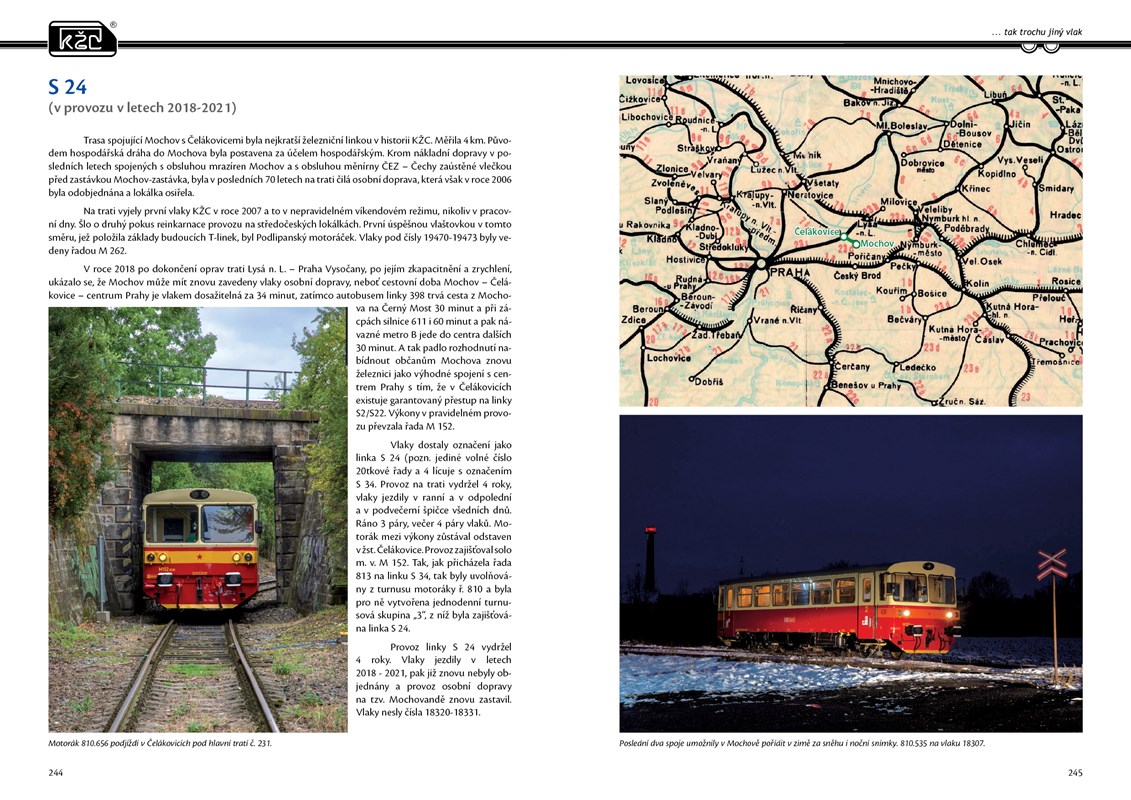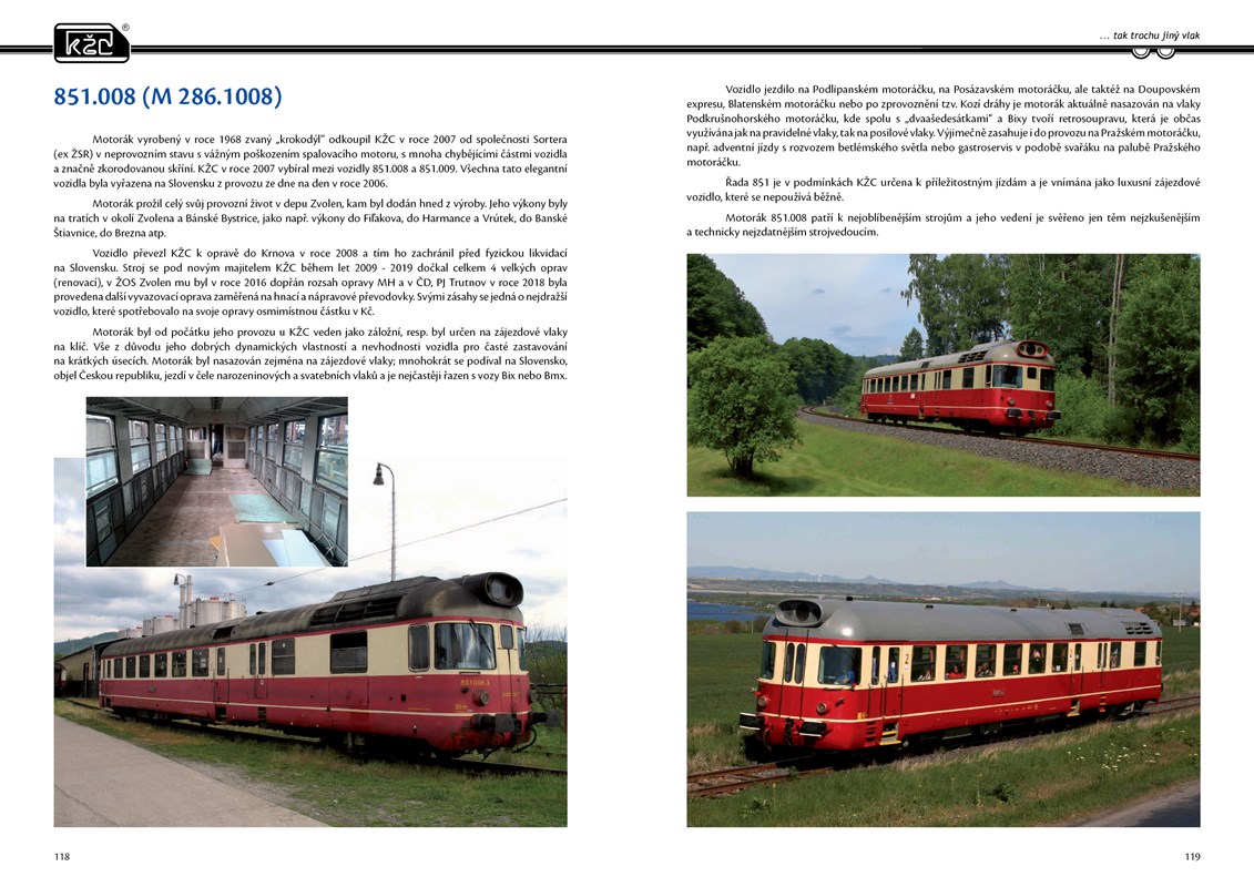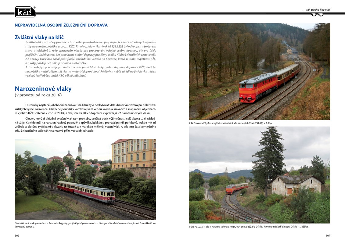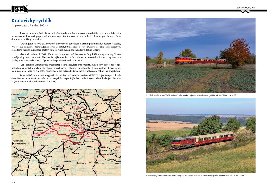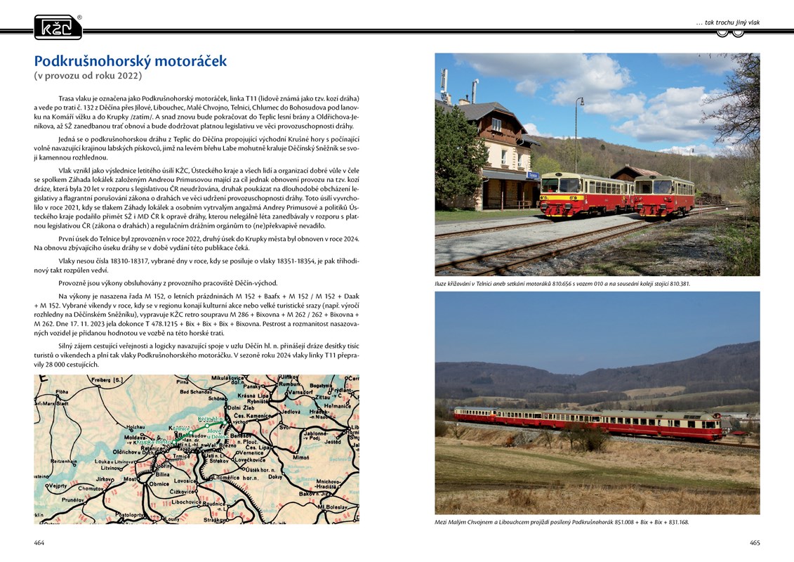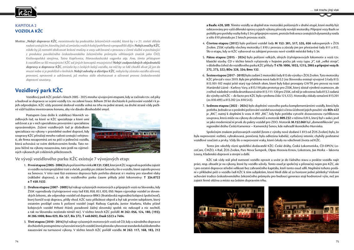 Příběh KŽC představuje oslavu železničního dopravce a jeho krásných, mnohdy i unkátních vozidel zachycených profesionálními fotografy mezi lety 2005 - 2025 na vlacích a výkonech KŽC. Kniha mapuje mimořádný příběh značky KŽC, jež vydržela jako jediná přes 40 let na české železnici. Železniční osobní dopravce, který existuje 20 let, je pro železniční fanoušky i obdivovatele železnice neustále přitažlivý provozem svých vozidel. Kniha obsahuje přes 500 kvalitních fotografií lokomotiv, motoráků a vlaků na nejkrásnějších místech ČR, SR a blízkého zahraničí. Jedinečné fotografie krásných vlaků s popisky jsou rozřazeny podle mapového podkladu železniční mapy, a tak čtenáři umožní snadnou orientaci v místopisu při prohlížení fotek v knize.