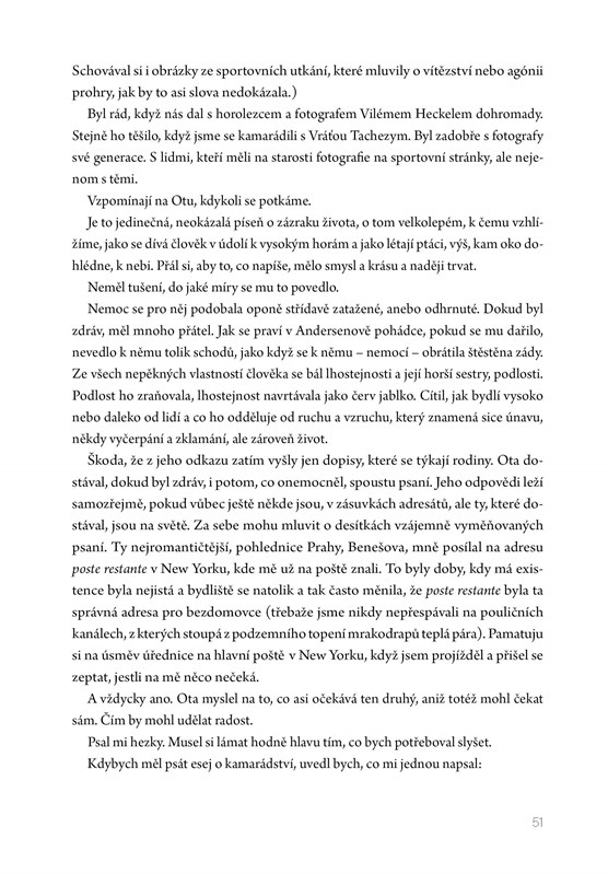 Osobní vyprávění se přirozeně prolíná s obrazem poválečné společnosti, jejích nadějí i rozporů. Na pozadí společenských a politických proměn vzniká portrét generace, která chtěla psát, tvořit a žít naplno. Kniha je tichou poctou Otovi Pavlovi a zároveň citlivou vzpomínkou na dobu, která zanechala hlubokou stopu v české kultuře.