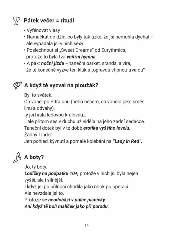 50 odstínů klidu (a kafe) je vtipná a laskavá kniha pro ženy, které vstoupily do padesátky s nadhledem, zkušenostmi a chutí žít po svém. Krátké kapitoly plné ironie, vzpomínek i tichého sebevědomí ukazují, že elegance nemusí bolet, krása není povinnost a největší luxus je vnitřní pohoda. Ideální dárek pro ženy, které už se nikomu nemusí dokazovat – jen si život vychutnat.