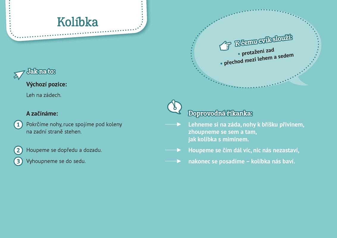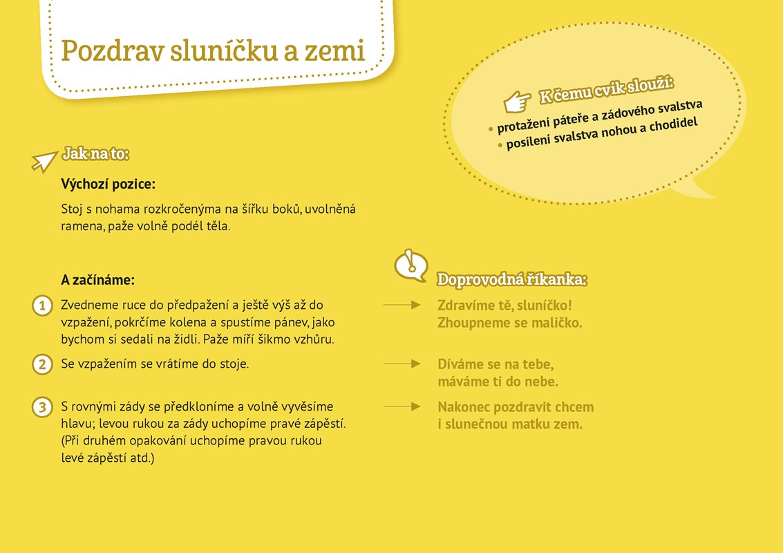 Karty jsou seřazené záměrně tak, aby se od aktivity postupovalo k uvolnění, počínaje snadnou sérií pohybů pro zahřátí a rozhýbání přes cviky ve stoje, s rukama na zemi, vsedě a vleže a konče dynamickou kompenzací a závěrečnou relaxací. Každá karta obsahuje krátký popis cvičení spolu s motivujícím obrázkem vhodným pro děti a lehkou říkankou k zapamatování.