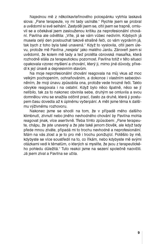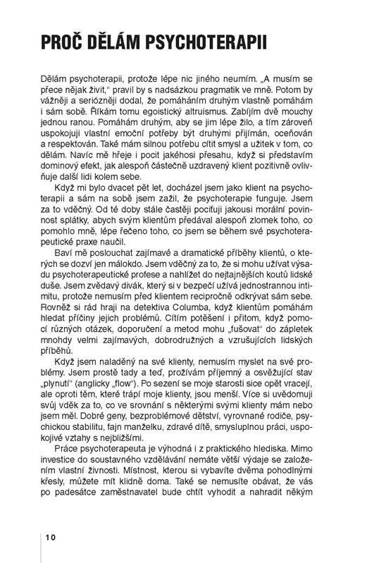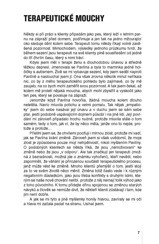Text bude jistě inspirující jak pro lidi pracující v pomáhajících profesích, tak pro laickou veřejnost, kterou výše nastíněné otázky zajímají. Z četných příběhů z psychoterapeutické praxe i otevřené sebereflexe autora si může každý odnést čtivý zážitek, ale i cenné sebepoznání. Text provázejí elegantní a vtipné ilustrace známého kreslíře Miroslava Bartáka.