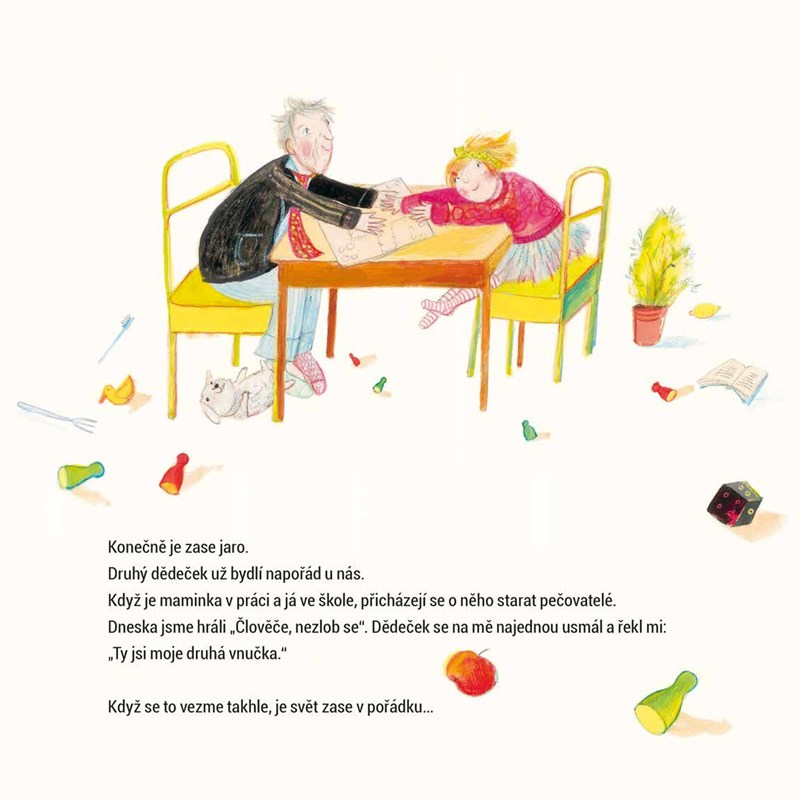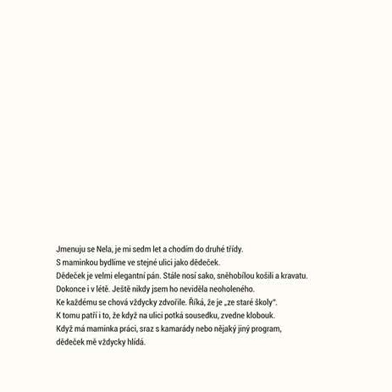 Má na ni vždycky čas a dává na ni pozor. Je to elegantní pán v bílé košili a saku, který každého přátelsky zdraví a smeká klobouk. Rád s Nelou chodí na procházky a na ryby nebo spolu pečou bábovku a navštěvují babičku na hřbitově. Jednou ale najde Nela dědečka doma neoholeného a v pyžamu. Uprostřed dne! Dědeček teď zapomíná všechno možné, někdy dokonce i Nelino jméno. Copak se s tím nedá nic dělat? „Ale dá!“ říká si Nela. Každopádně se hned zítra naučí, jak dědečkovi uvázat kravatu a jak ho oholit. Odteď bude nejspíš muset dávat pozor ona na něj – svého druhého dědečka.
