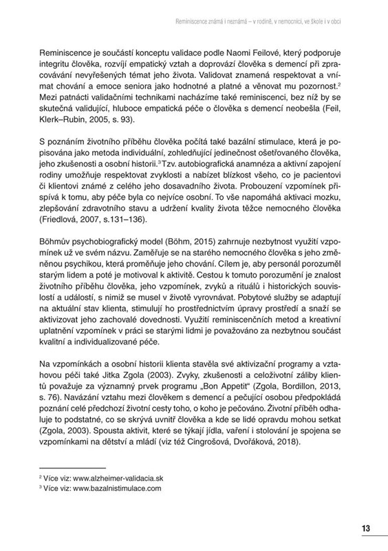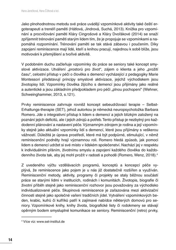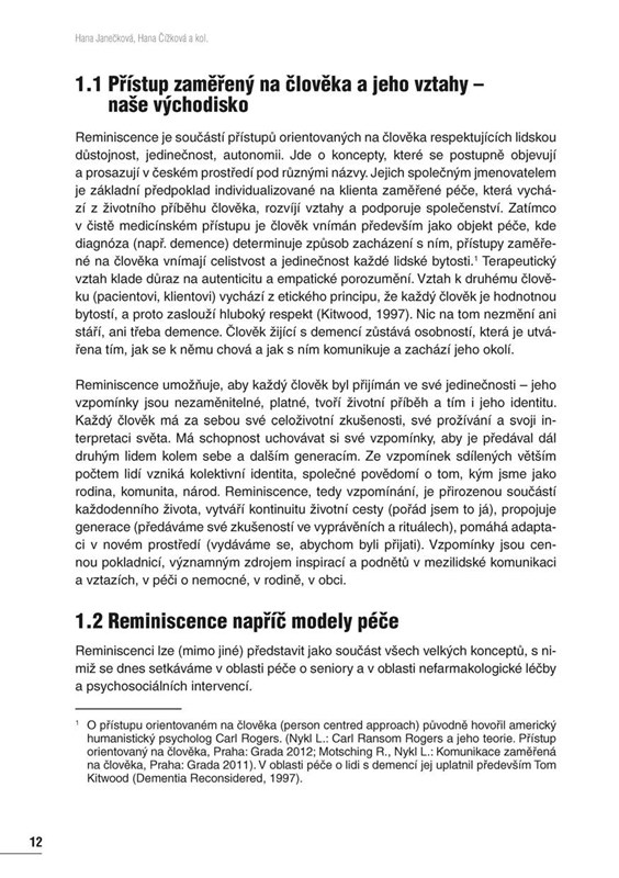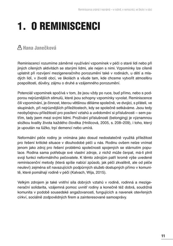 Kniha Reminiscence známá i neznámá shrnuje bohaté zkušenosti členů Reminiscenčního centra. Naleznete v ní komplexní přehled reminiscenčních metod, aktivit, programů a projektů, které jsou běžnou součástí práce se starými lidmi v institucích, rodinách i komunitách.