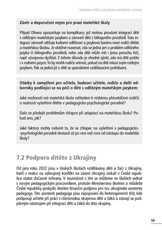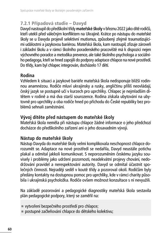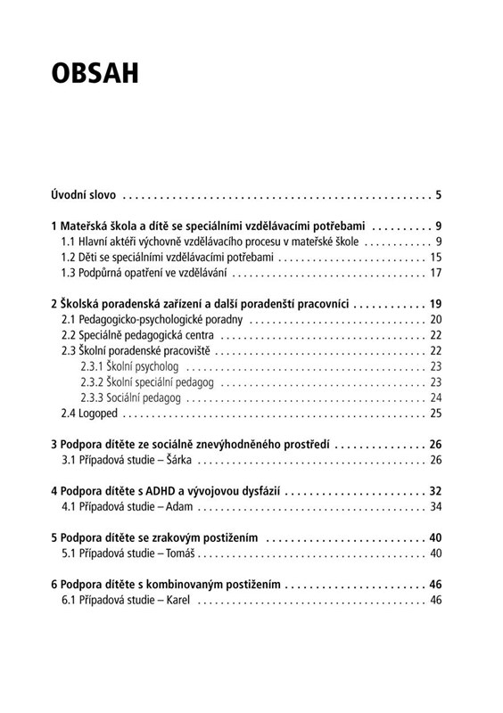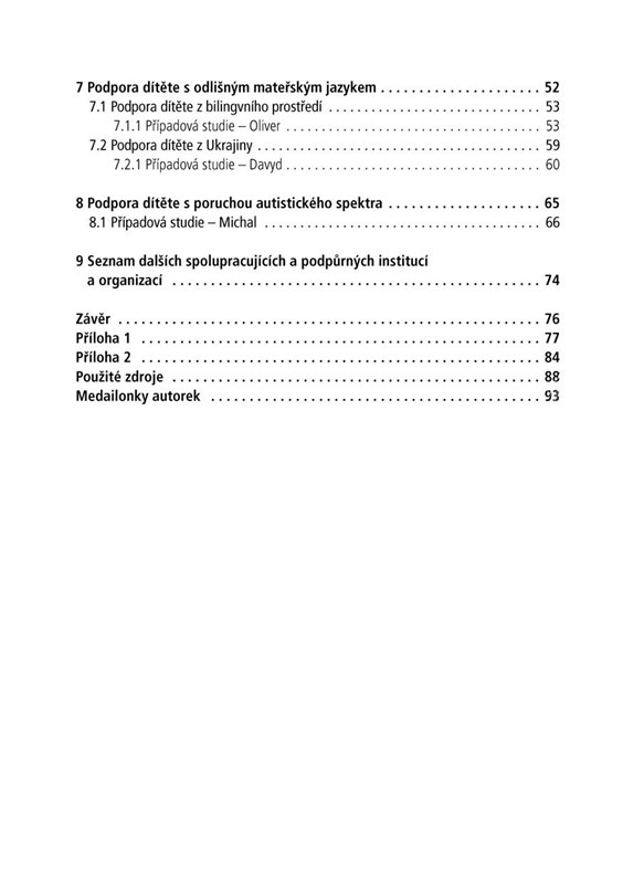 V knize je představeno sedm případových studií, jejichž prostřednictvím autorky nastiňují způsoby podpory dítěte ze sociálně znevýhodněného prostředí, dítěte s ADHD a vývojovou dysfázií, se zrakovým postižením, s kombinovaným postižením, dětí s odlišným mateřským jazykem a také dítěte s poruchou autistického spektra. Nechybí ani seznam dalších spolupracujících a podpůrných organizací a ukázka Individuálního vzdělávacího plánu a Plánu pedagogické podpory.