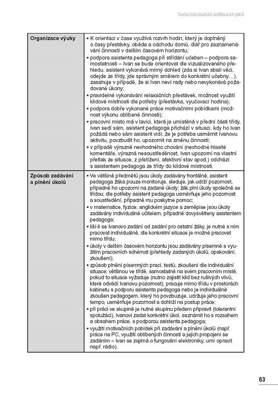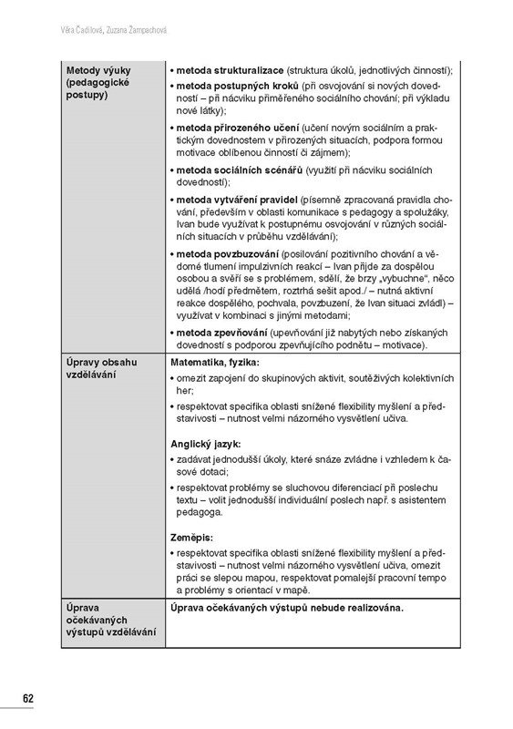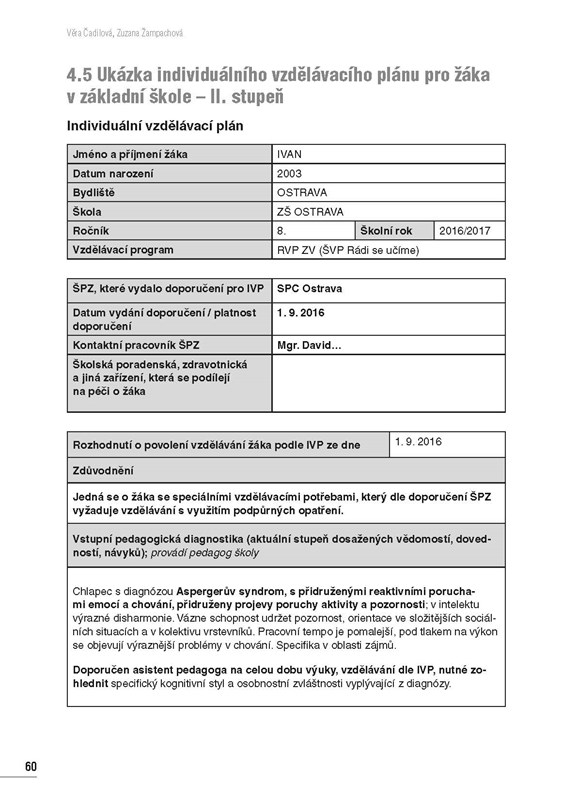 Publikace umožní pedagogickým pracovníkům zpracovávat IVP pro žáky s PAS, které jsou, dle nové legislativy, nositeli podpůrných opatření individuálně stanovených pro žáky s poruchami autistického spektra. Vzor k sestavení IVP je součástí vyhl. č. 27/2016 Sb. Autorky interpretují jednotlivé položky vzoru IVP tak, aby se v nich pedagogičtí pracovníci orientovali, uměli naplnit jejich obsah a s vytvořeným IVP aktivně pracovali. Součástí publikace jsou ukázky IVP pro jednotlivé typy školských zařízení (MŠ, ZŠ, SŠ).