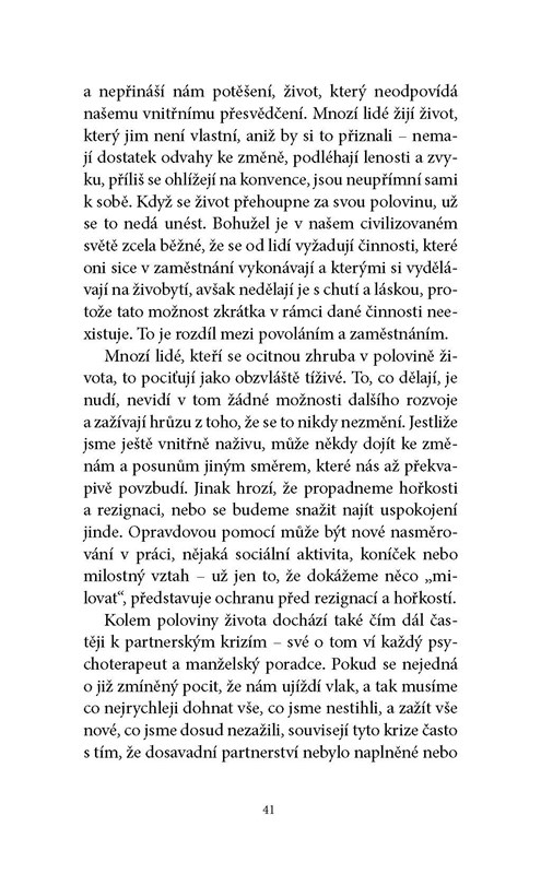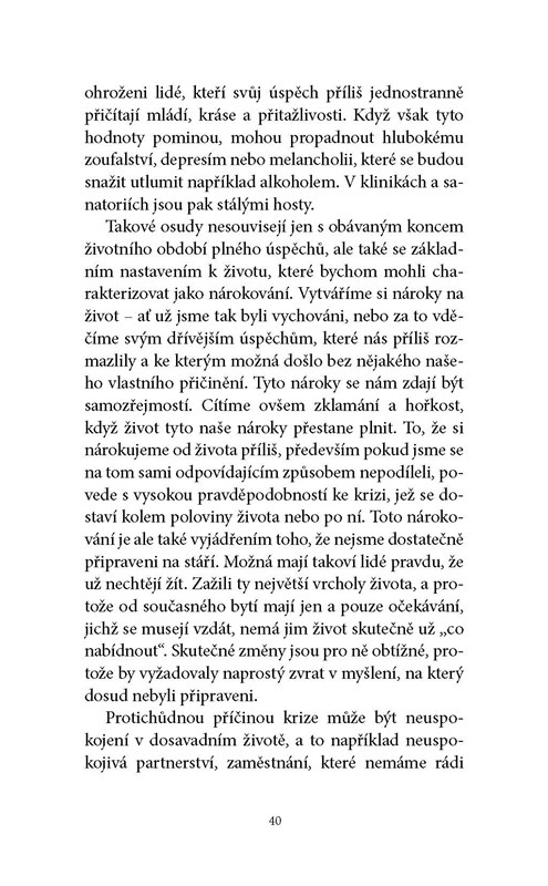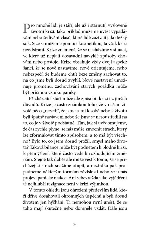 Známý německý psycholog a psychoanalytik Frizt Riemann přistupuje k této životní etapě odlišně. Umění stárnout chápe jako umění žít. Ve své knize se nevyhýbá složitým problémům stárnutí a stáří, nezůstává ale u jeho nedostatků. Na základě bohaté psychoanalytické praxe i svých osobních zkušeností upozorňuje na možnosti a šance, které se v této životní etapě otevírají a které, jsou–li využity, vedou k vnitřní svobodě a duševnímu růstu.