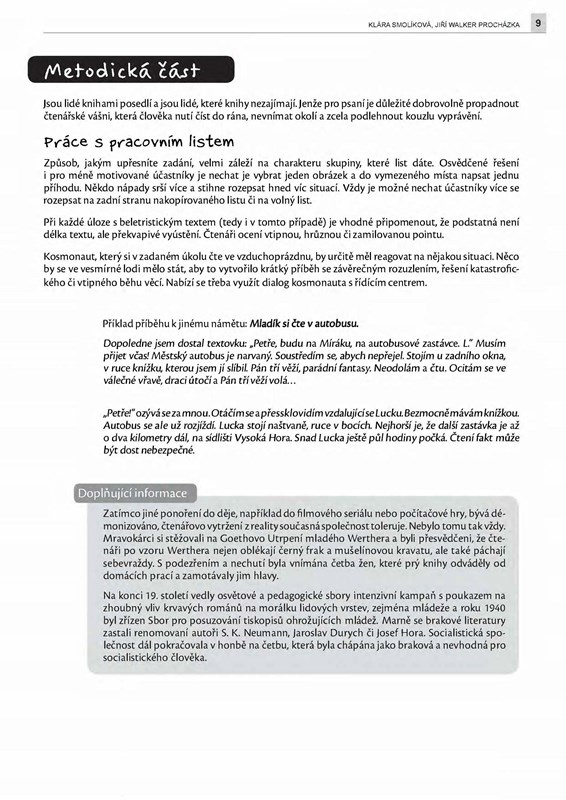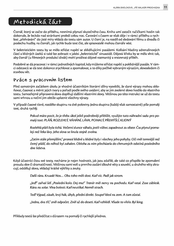 Ke každému pracovnímu listu je připojena metodika pro učitele, knihovníky a další zájemce, která přibližuje práci s jednotlivými úkoly, představuje možné zasazení tématu do širších souvislostí a nabízí další navazující aktivity. Nápadité rozehrávky přispějí též k dosažení očekávaných výstupů jazykové výchovy, protože vedou k aktivní práci se slovní zásobou, učí přemýšlení nad stavbou textu, vztahem mezi přímou a nepřímou řečí či nad neobvyklostmi literárního vyjadřování. Vzhledem k tomu, že oba autoři jsou zároveň spisovateli, rozhodli se nevyužívat ukázky z publikovaných knih, ale jednotlivé rozehrávky sami vymýšlejí