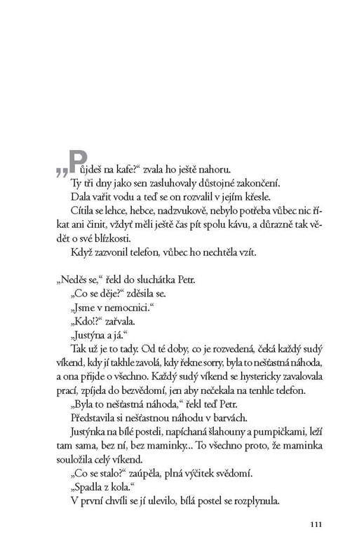 Náhodou mi to sluší, dodávala si kuráže v souladu se stále pestřejšími odstíny líčidel. Sice by to mohlo být lepší, ale mohlo by to také být horší, utěšovala se. Jako ostatně všechno.