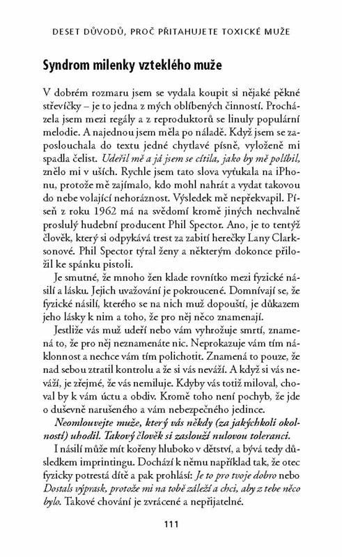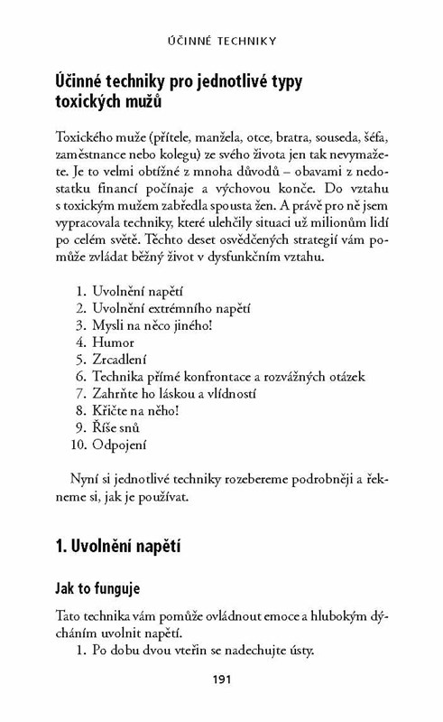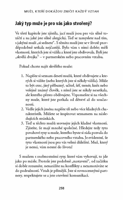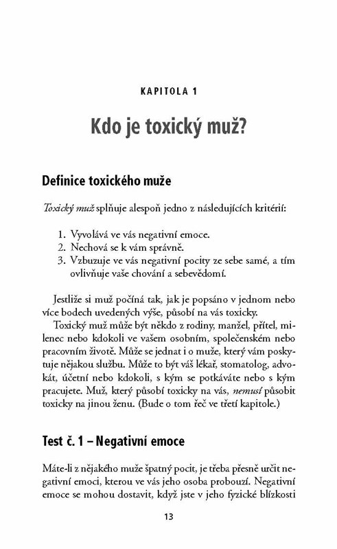 Muži, kteří dokážou zničit každý vztah, tzv. toxičtí muži, zkříží cestu nejedné z nás. Chodíme s nimi, vdáváme se za ně nebo pro ně pracujeme. Narážíme na ně v rodině, v okruhu přátel i kolegů. Doktorka Lillian Glassová, uznávaná expertka na komunikaci, nás naučí tyto lidi spolehlivě poznat podle slovních i mimoslovních projevů a poradí nám, jak se jim vyhnout. Dozvíme se také, jak se můžeme toxického muže zbavit, pokud se v naší blízkosti už zabydlel a vytrvale nám komplikuje život. A konečně zjistíme, jak se z nezdravého vztahu zotavit a začít nový život – třeba po boku netoxického muže.