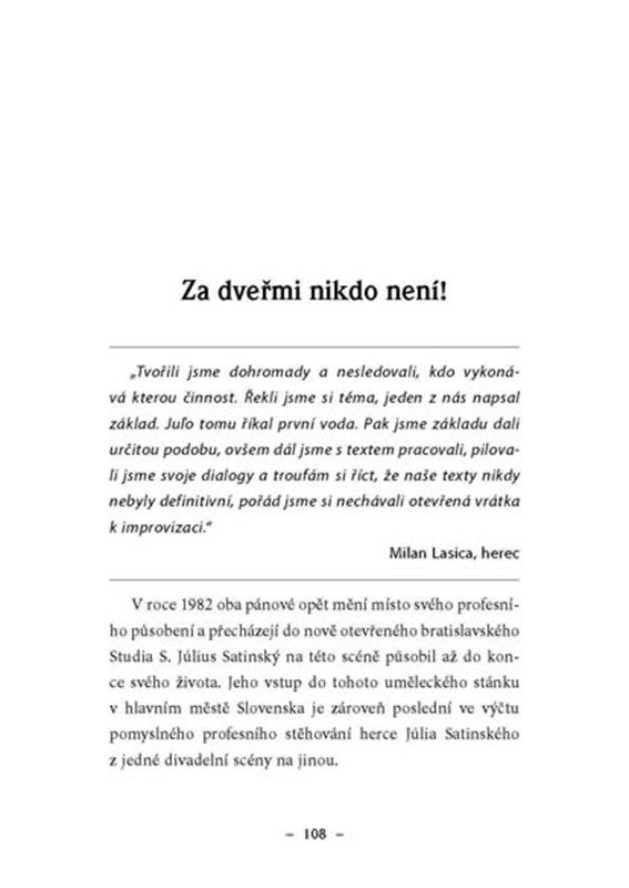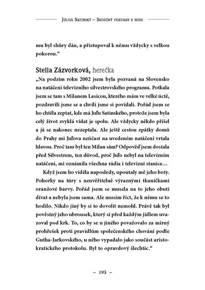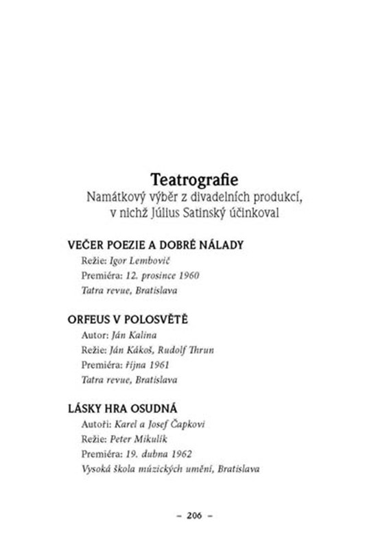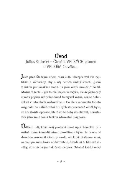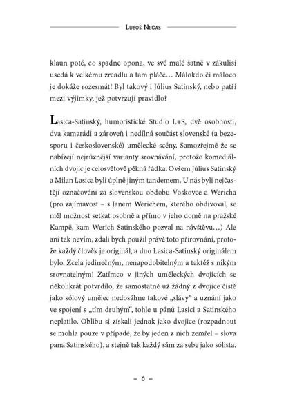 Július Satinský – oblíbený slovenský herec, kterého dodnes mají čeští a slovenští diváci vepsaného ve svých srdcích, zdatný spisovatel, který s nadhledem glosoval dění kolem sebe, komik, jehož rozhled a cit pro vtip byl ojedinělý. Jaký byl Július Satinský v soukromí, co o něm prozrazují jeho texty, jak na něho vzpomínají přátelé, rodina, spolupracovníci? Na tyto otázky Vám odpoví Luboš Nečas.