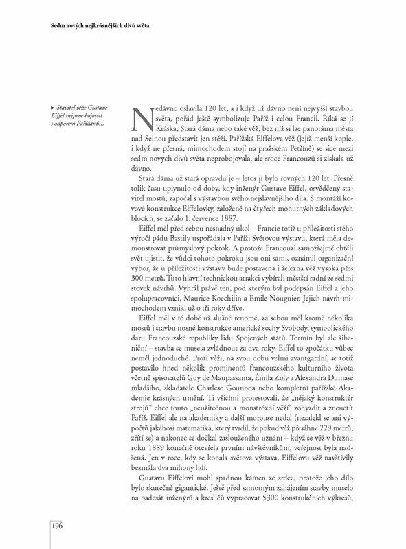 Od dob řeckého učence Filóna Byzantského, který ve své knize popsal starověkých sedm divů světa, uplynulo více než 2000 let. Z jeho divů se však do dnešních dnů zachovaly jen egyptské pyramidy, a tak se zrodila myšlenka vybrat nových sedm divů světa. Pomocí nejmodernější techniky mohli hlasovat lidé celé zeměkoule, aby vybrali to nej. Den D nastal 7. 7. 2007. A které památky zvítězily? Představí vám je naše publikace, v níž vám budou průvodcem krásné fotografie a zajímavý text. A nejen to. Seznámíte se i s