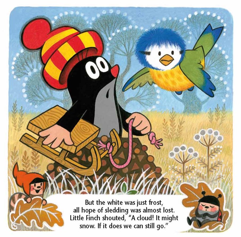 Konečně je tu zima! řekl si Krtek a vytáhl sáňky. Ale co to? Bílo je všude, ale sníh to není, jen jinovatka. Copak se dá na jinovatce sáňkovat? Na obloze je jen jediný mráček, mráček chudinka, z toho chumelit nebude, postěžoval si Krtek. Ale když se Krtek se sýkorkou postarali, aby se mráček napil vody, mráček rostl, mohutněl, až se z něj začaly sypat vločky, jedna pěknější než druhá. A sníh se sypal, až jim sáňky v závěji téměř zapadly.