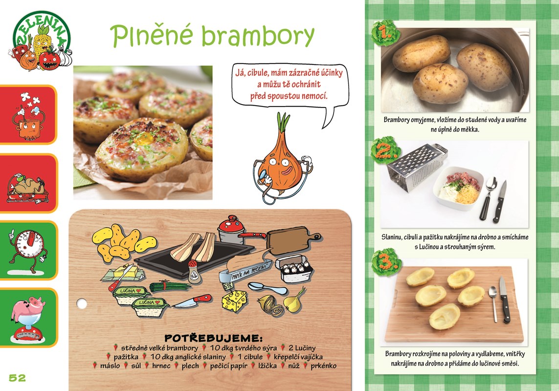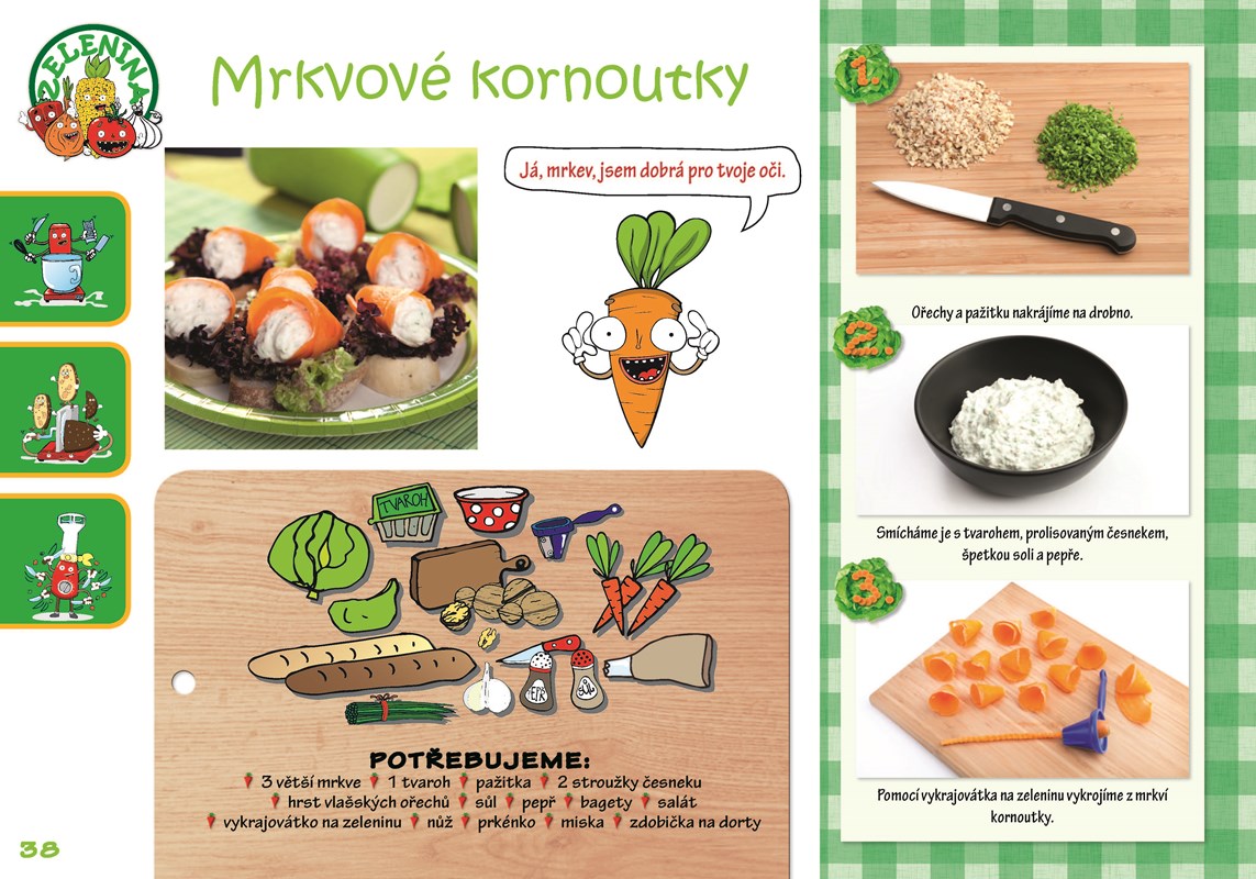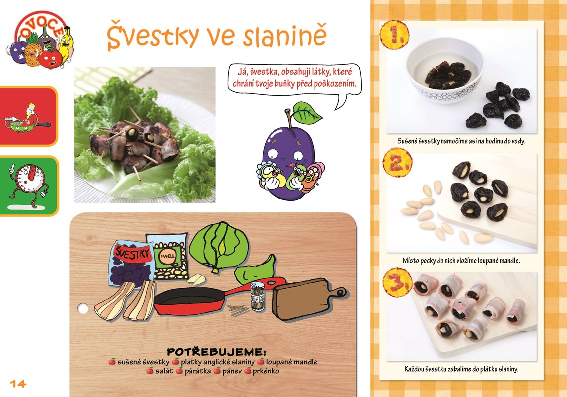 ale také o nebezpečích číhajících v kuchyni a jak se jim vyhnout, o šikovných kuchyňských pomocnících a nakonec i o správném stolování. Pak již následují konkrétní recepty, které jsou podle složení rozděleny na kapitolu Ovoce a Zelenina. U každého receptu se od jedné z těchto legračních ingrediencí dozvíte,