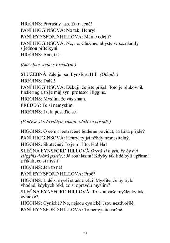 Pygmalion, dílo irského satirika Georgie Bernarda Shawa, nositele Nobelovy ceny za Literaturu popsuje příběh, kdy londýnský profesor fonetiky Henry Higgins vdechne nový život chudé květinářce Líze Doolittleové tím, že ji naučí správně vyslovovat a vybraně se chovat. Podaří se mu to tak dokonale, že ani londýnská smetánka nepozná dívčin nízký původ. Co je nejdůležitější, Líza pozná svou cenu a začne si vážit sama sebe.