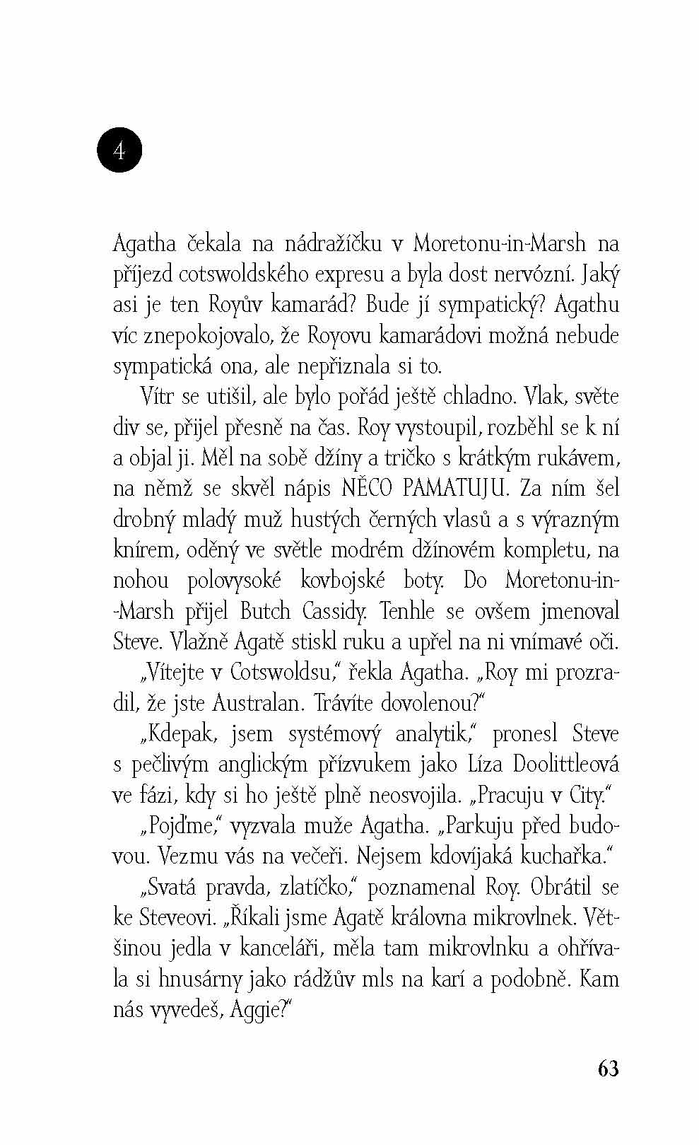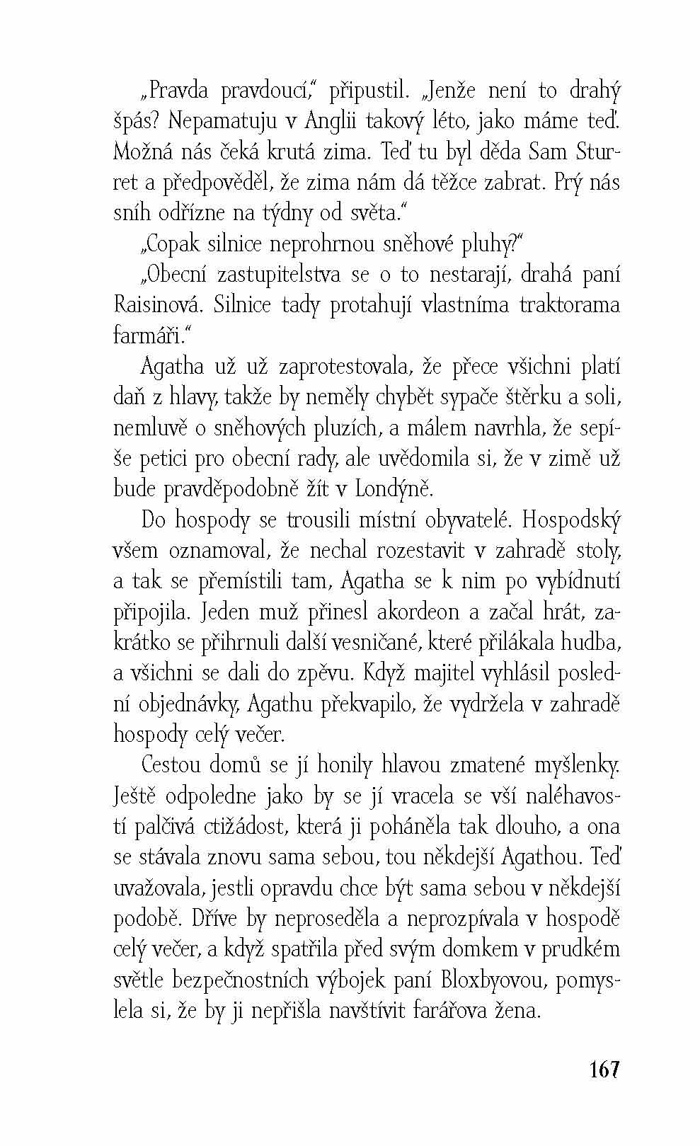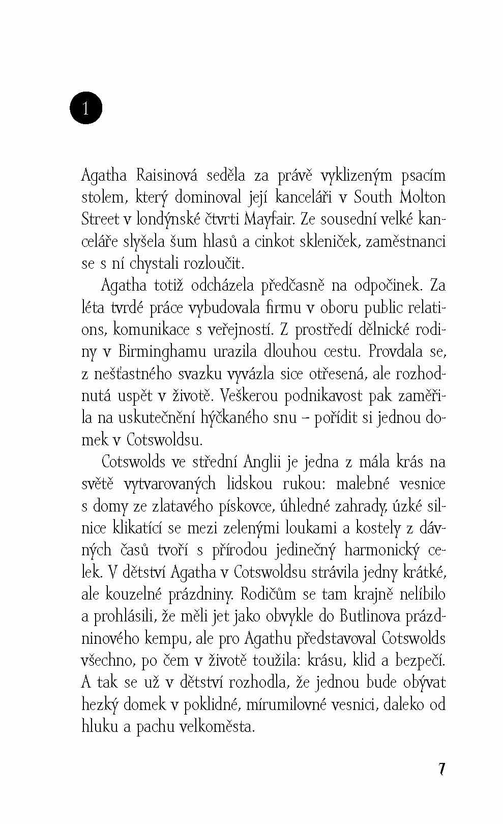 Agatha Raisinová, úspěšná londýnská podnikatelka, se ze dne na den rozhodne skoncovat se svým dosavadním životem. Prodá nejen svou PR firmu, ale i londýnský byt a odstěhuje se do poklidné anglické vesničky Carsely, kde si chce užívat předčasný důchod. Jenže po krátkém čase si uvědomí, že Carsely je na ní až moc poklidné a že se jí nedaří navázat přátelské vztahy s místními. Rozhodne se proto zúčastnit tamější soutěže o nejlepší koláč, a to přestože za celý život tak nanejvýš ohřívala jídlo v mikrovlnce. Aby měla šanci vyhrát, koupí koláč v jednom z nejlepších londýnských lahůdkářství a hodlá ho vydávat za svůj výtvor. Jenže soutěž se nakonec nevyvine podle jejích představ, arbitr se na ni dívá skrz prsty a po ochutnání jejího koláče navíc zemře. Agatha je tedy najednou podezřelá z vraždy, a nadto musí přiznat, že podváděla. Aby mohla očistit své jméno, nezbývá jí nic jiného než sama vypátrat, kdo skutečně vraždil.
