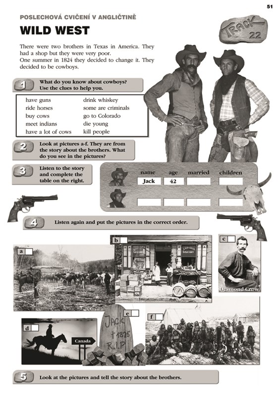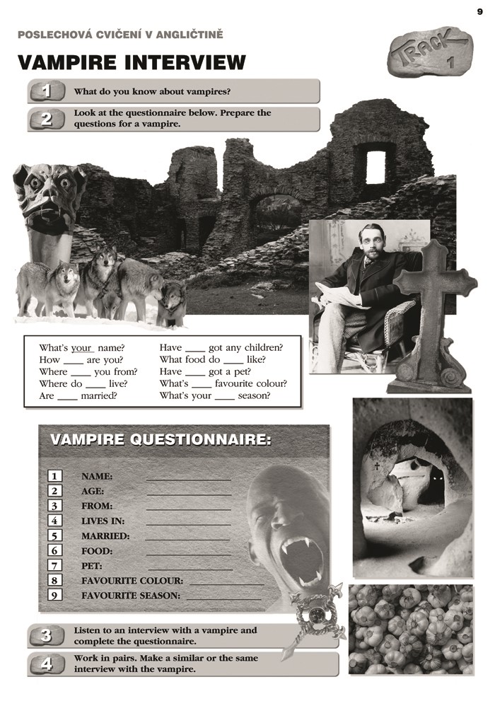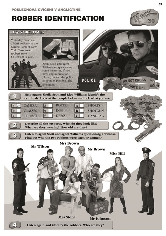 Levá strana obsahuje stručnou, ale věcnou metodiku k přípravě na poslech. Najdete na ní i výběr méně známých slovíček. Je zde okno s obrázkem, které napovídá, do jaké kategorie aktivita patří: hororová, legrační, historická, z běžného života. Ve spodní polovině stránky je pak kompletní přepis poslechu, který je možné využít i v případě, že nechcete aktivitu využít k poslechu, ale ke čtení.