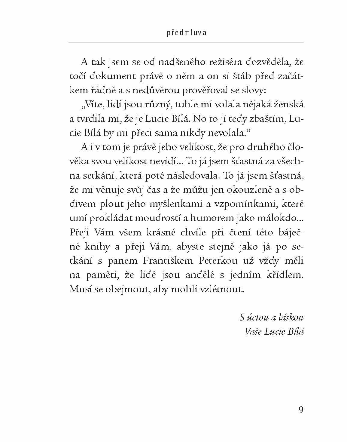 Rozjímání o životě s duchovně založeným hercem Františkem Peterkou. Filmoví fanoušci ho znají především z filmů Zítra to roztočíme, drahoušku nebo Co je doma, to se počítá, pánové, v nichž hrál partnera Ivy Janžurové, nebo jako Krakonoše z Krkonošských pohádek. Tento nestor českého filmu, který letos oslavil devadesáté narozeniny, vzpomíná na své dětství a mládí, na herecké začátky i na těžký úraz, který mu změnil život.