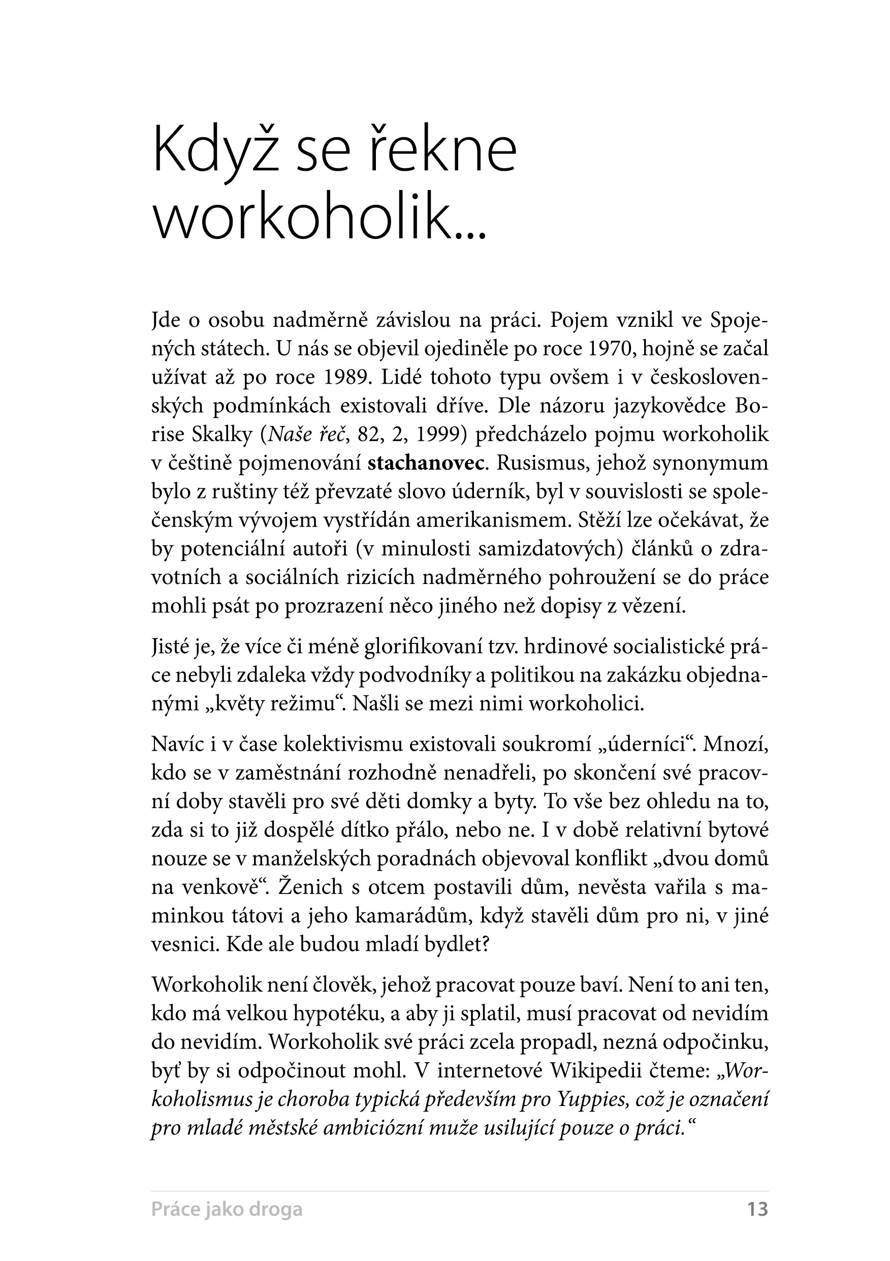 Zabývá se relativně nejsympatičtější drogovou závislostí – workoholismem, závislostí na práci. O problémech workoholiků i jejich blízkých knížka pojednává realisticky, s nadhledem a bez moralizování. Vyhýbá se obecně známým, dobrým, nicméně pramálo splnitelným radám. Místo nich nabízí skutečná řešení pro workoholiky a jejich rodiny, ale i pro ty, kterým tato závislost zatím jen hrozí.