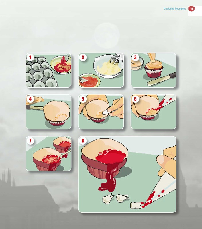 Každý recept obsahuje instrukce a ilustrace krok za krokem k pečení i výrobě ozdob, stejně jako pekelnou fotografii. Najdete tu také základní recepty pro přidávání dekorativních detailů. Tyto košíčky zaručeně zvednou náladu i v té nejmrtvější společnosti.